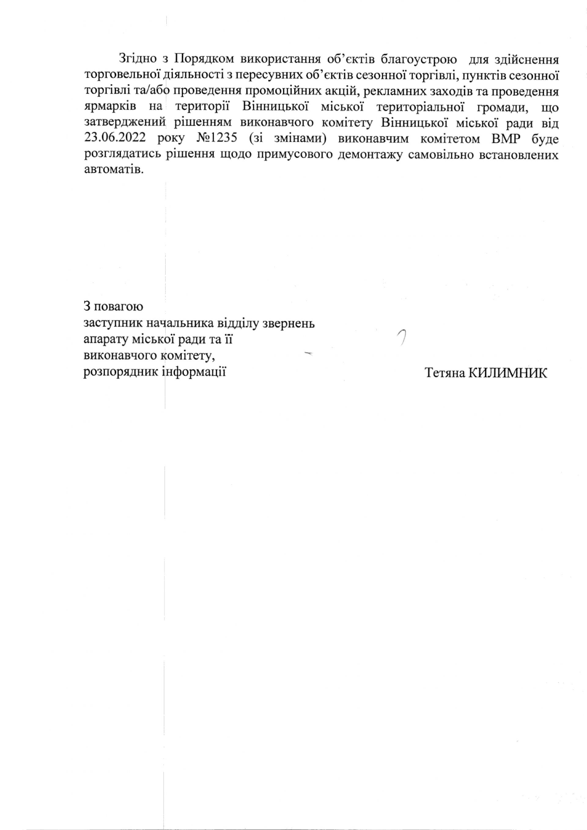 За Порядком використання об'єктів благоустрою для здійснення торговельної діяльності з пересувних об'єктів сезонної торгівлі (...), що затверджений рішенням виконкому від 23 червня 2022 року №1235 (зі змінами) виконавчим комітетом Вінницької міськради буде розглядатись рішення щодо примусового демонтажу самовільно встановлених автоматів.