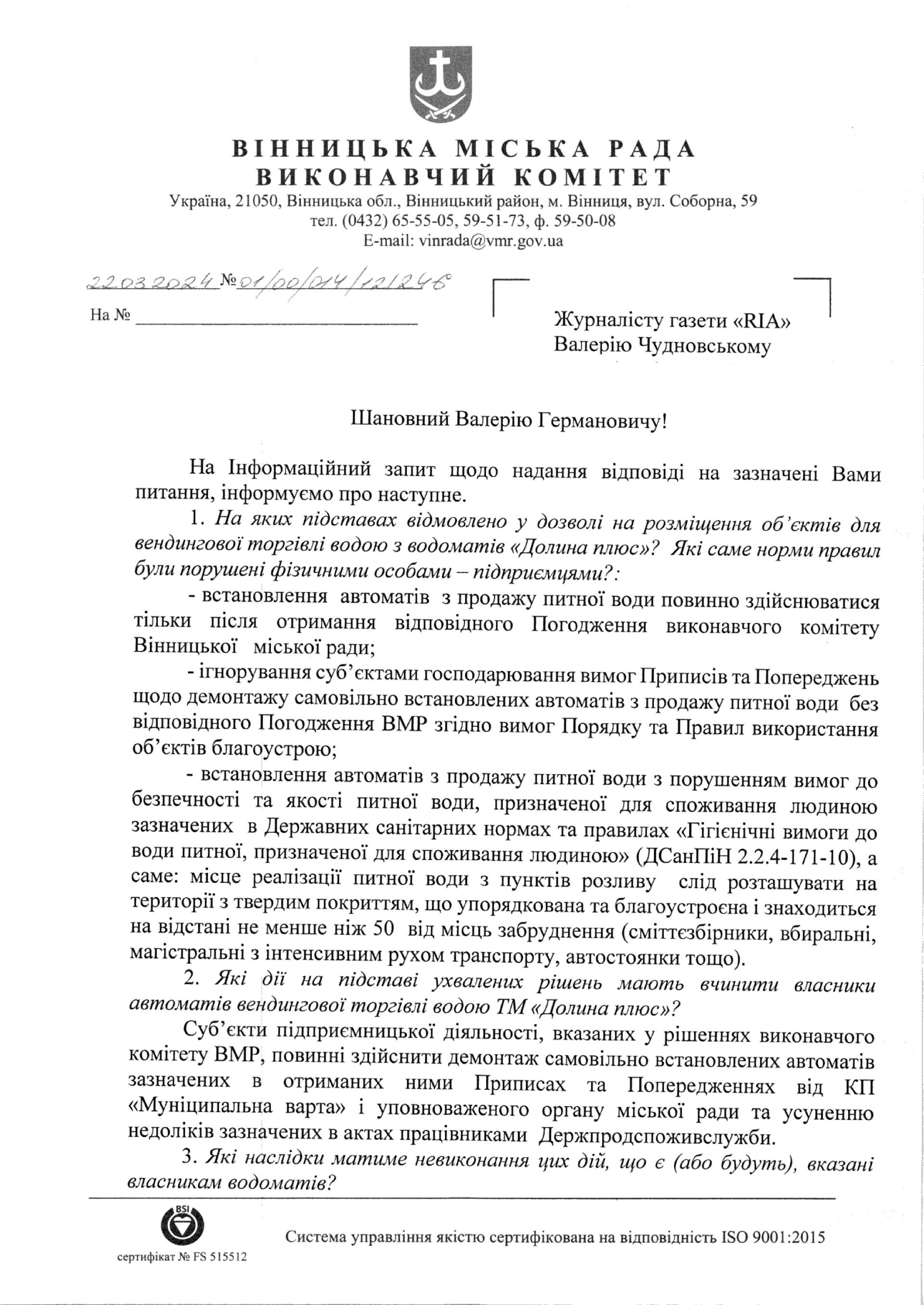 - У середині березня виконком міськради ухвалив пакет рішень, якими заборонив «Долині плюс» подальше розміщення водоматів у Вінниці.