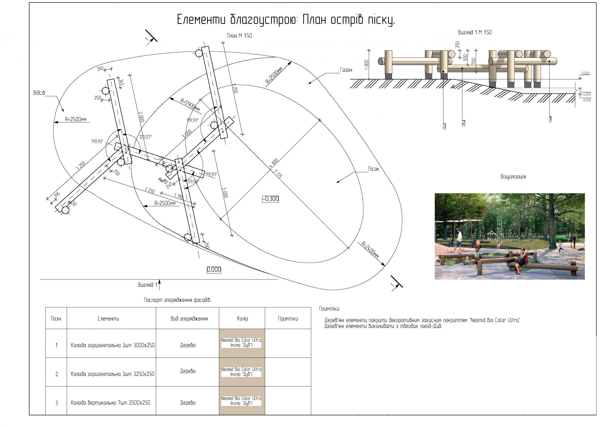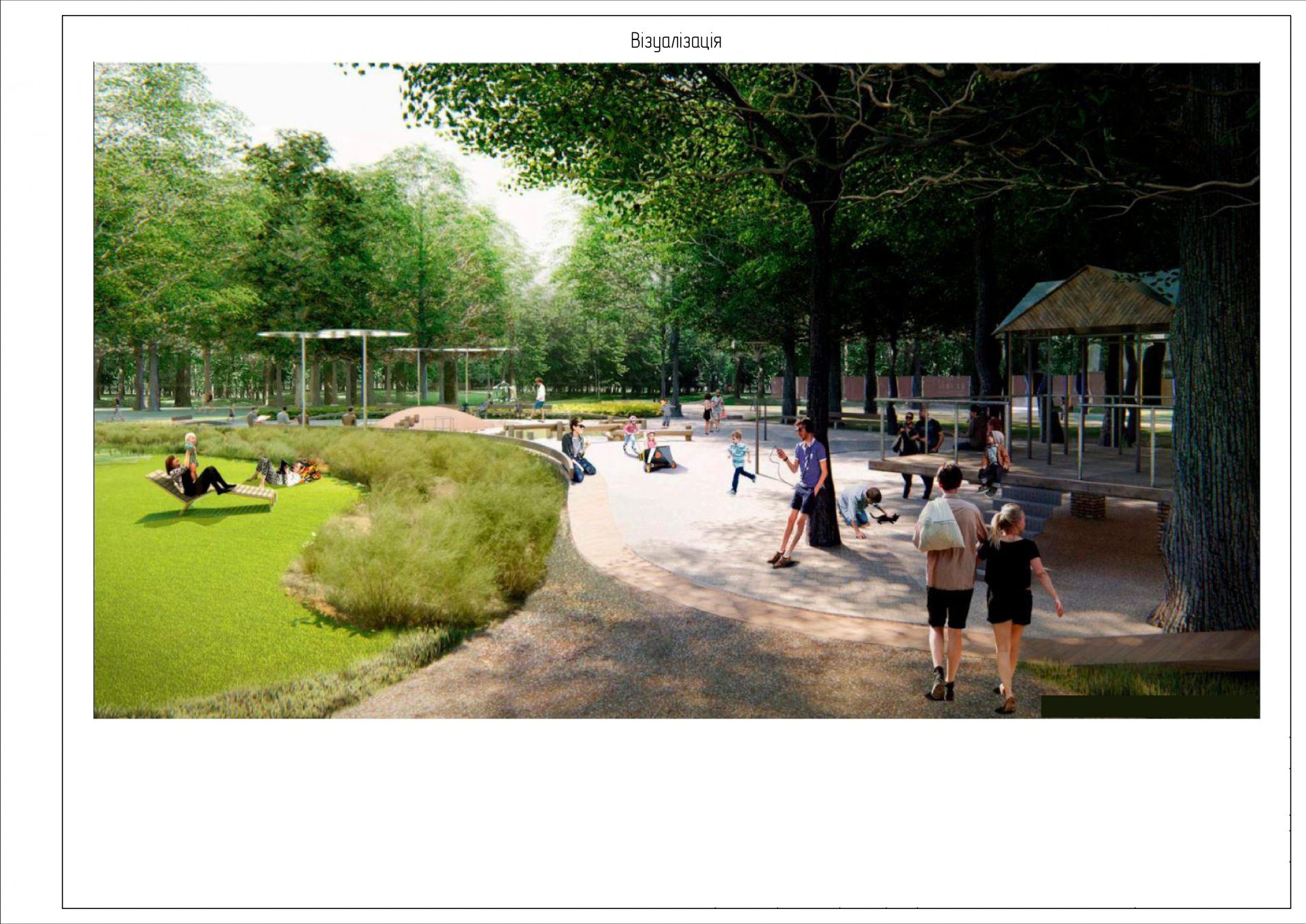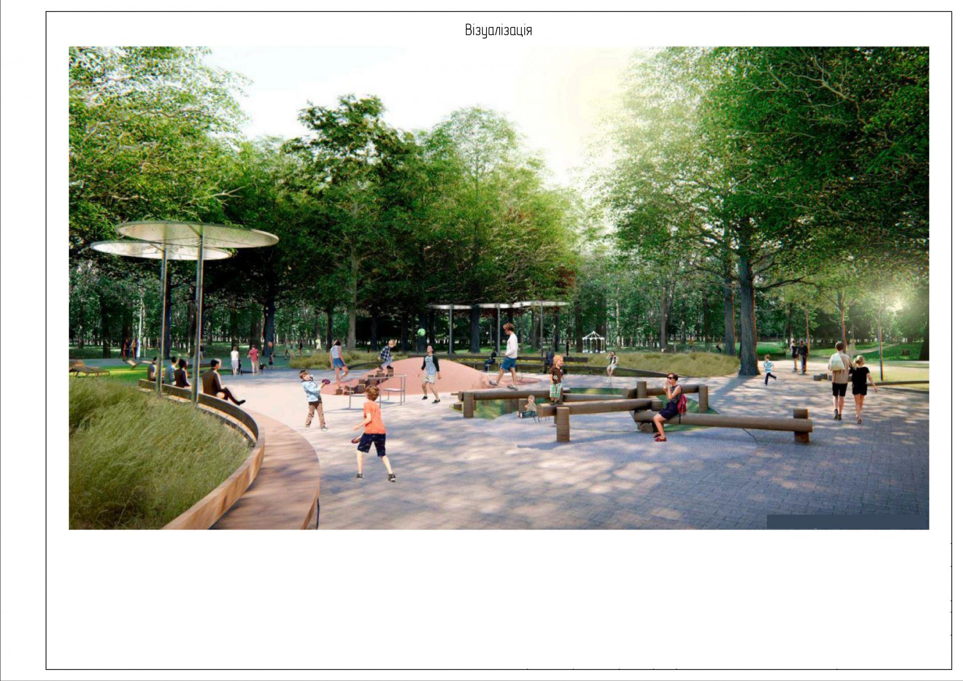Крізь територію парку наново прокладають пішохідні та велодоріжки. І далі у документації йдеться про озеленення території: 1,2 гектара мають засіяти газонами та висадити дерева, кущі, квіти.