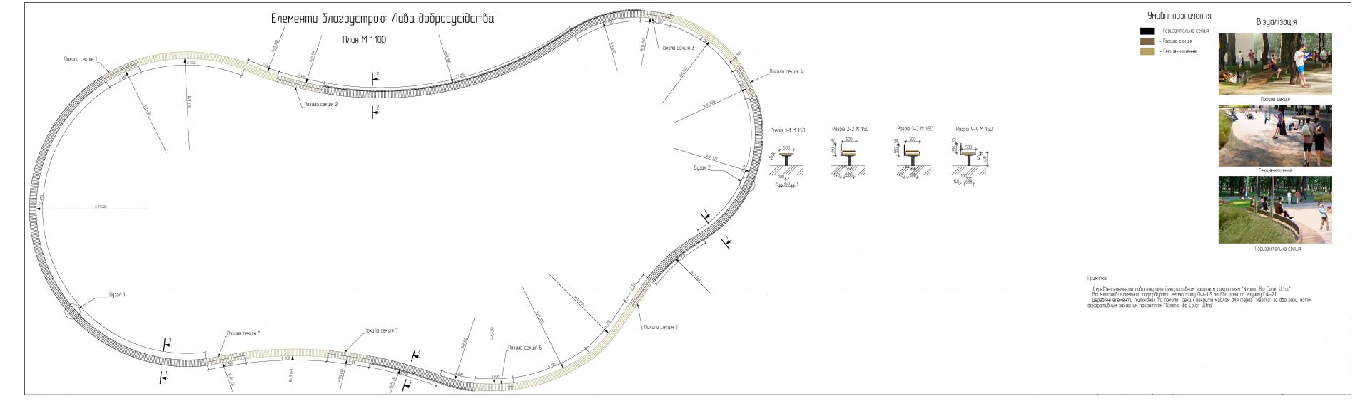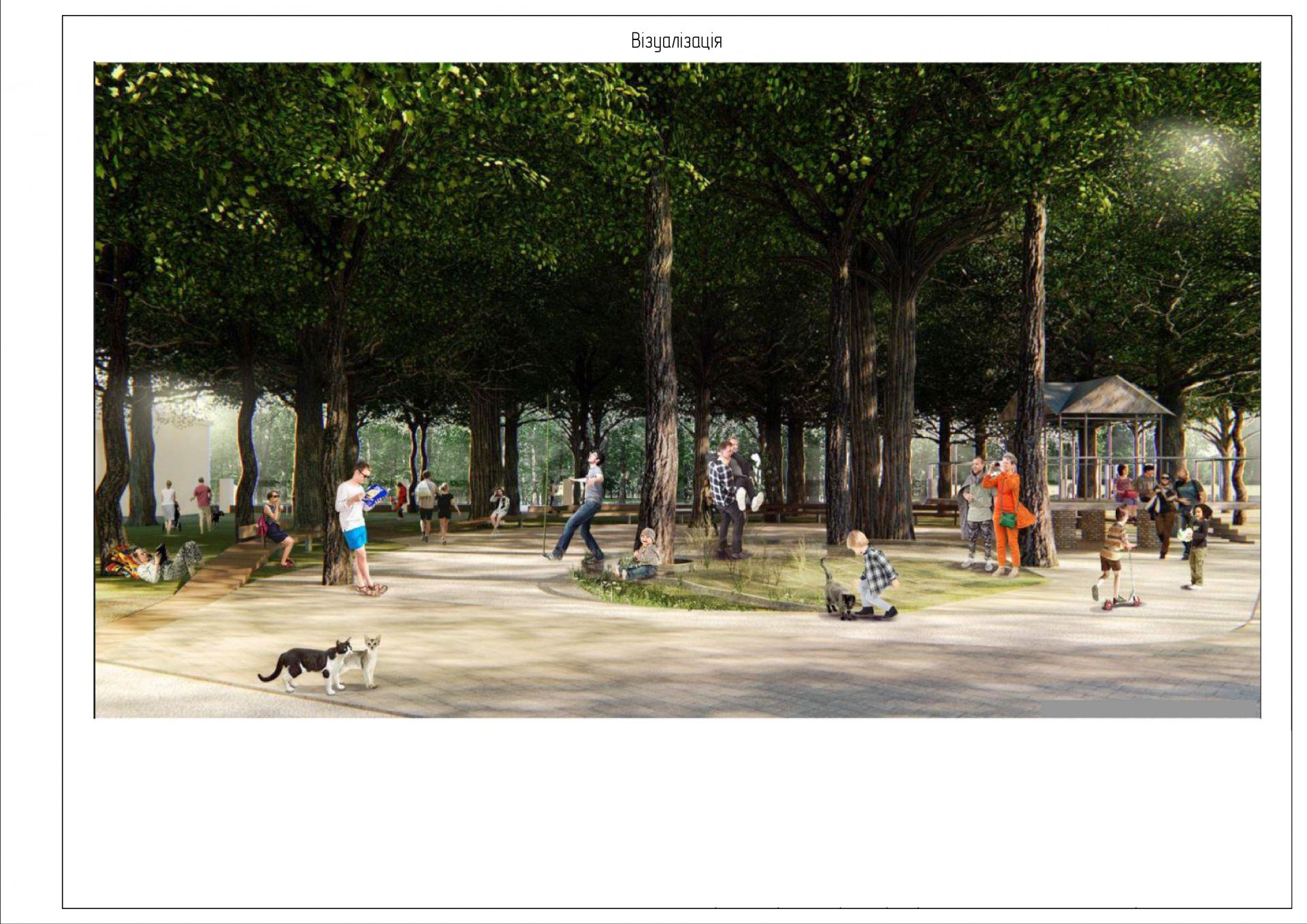 Пряма алея крізь парк стане хвилястою, для приємних прогулянок. Зруйнований паркан та арка — під реконструкцію. Передбачений монтаж нових дитячих майданчиків, ключової локації з лавкою добросусідства та подіумом для вуличних виступів тощо.