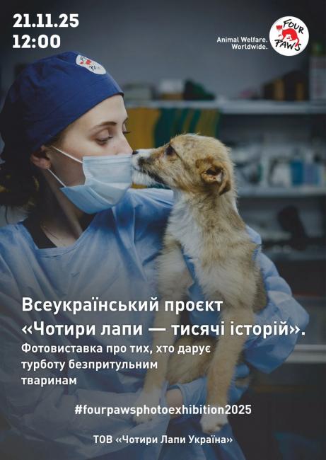 Історії порятунку тварин у війні покажуть у Вінниці — 21 листопада о 12.00 у ТЦ «Sky Park» стартує фотовиставка «Чотири лапи — тисячі історій». Знімки передають моменти, коли люди рятують безпритульних, лікують їх та дають шанс на нове життя.