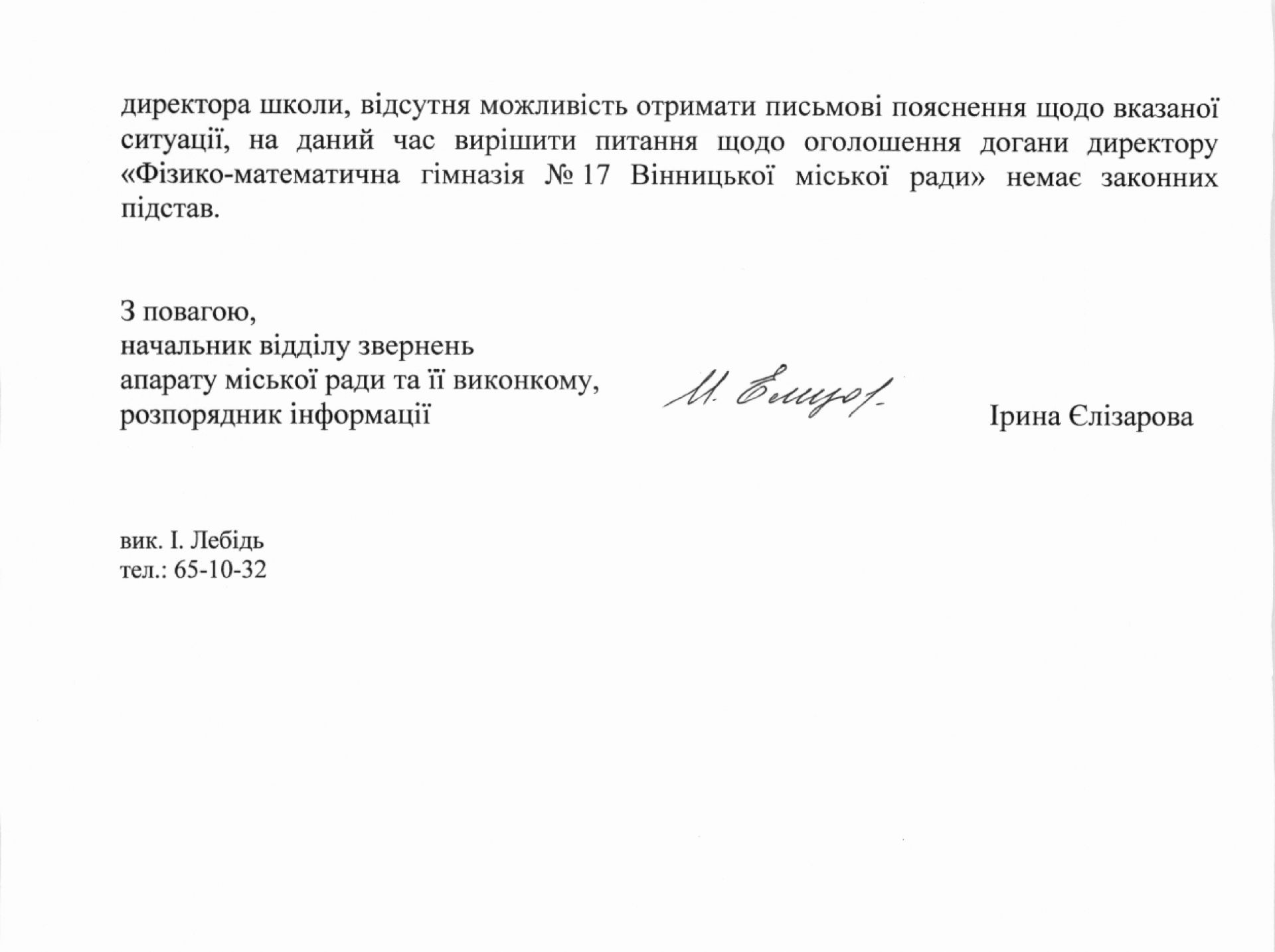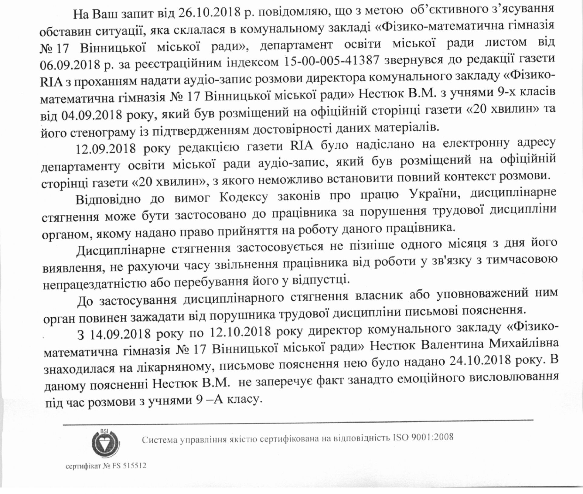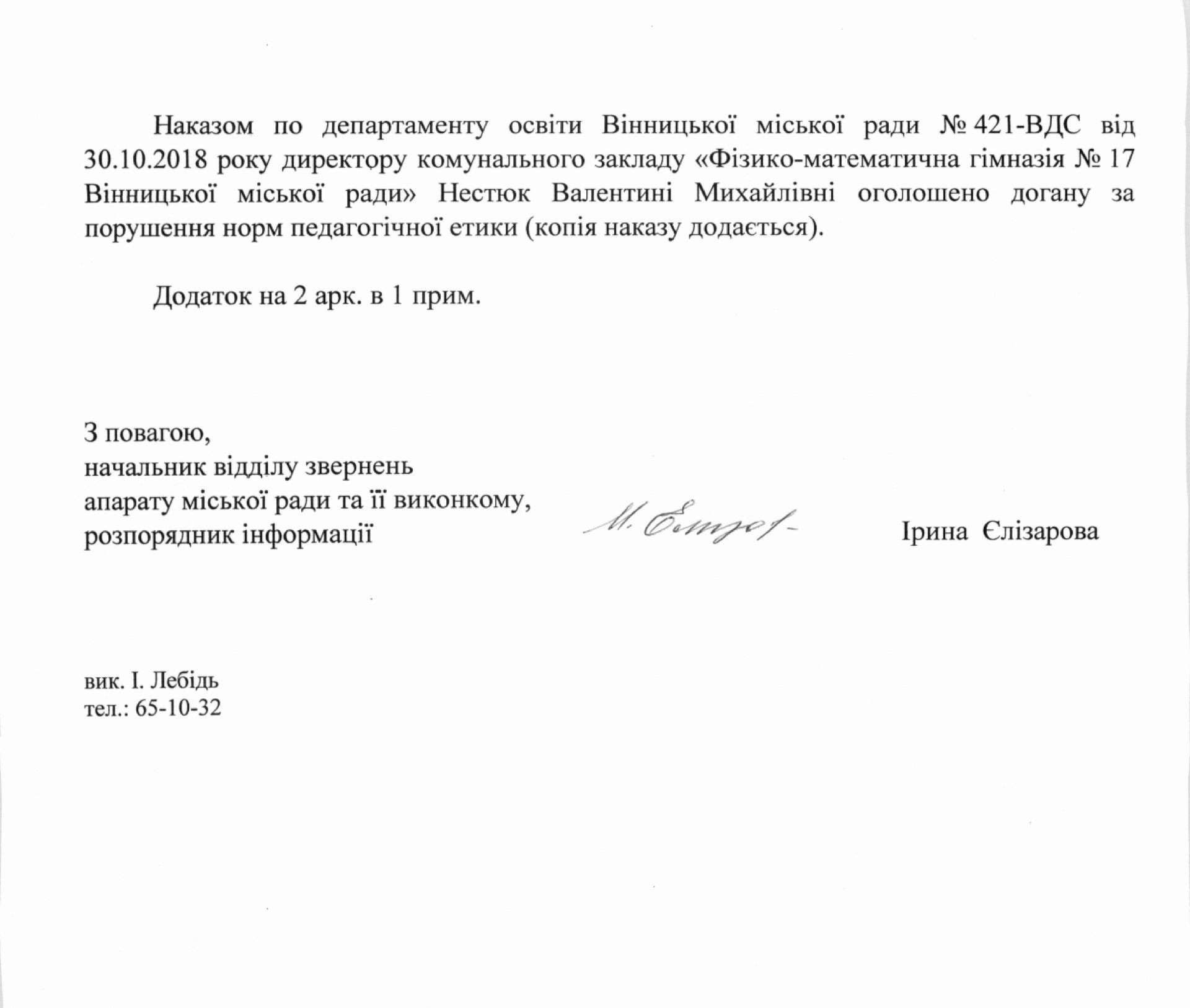 Коли Валентина Нестюк повернулася з лікарняного, ми написали ще один запит. З відповіді дізналися, що директорка визнала провину. І догану таки отримала.