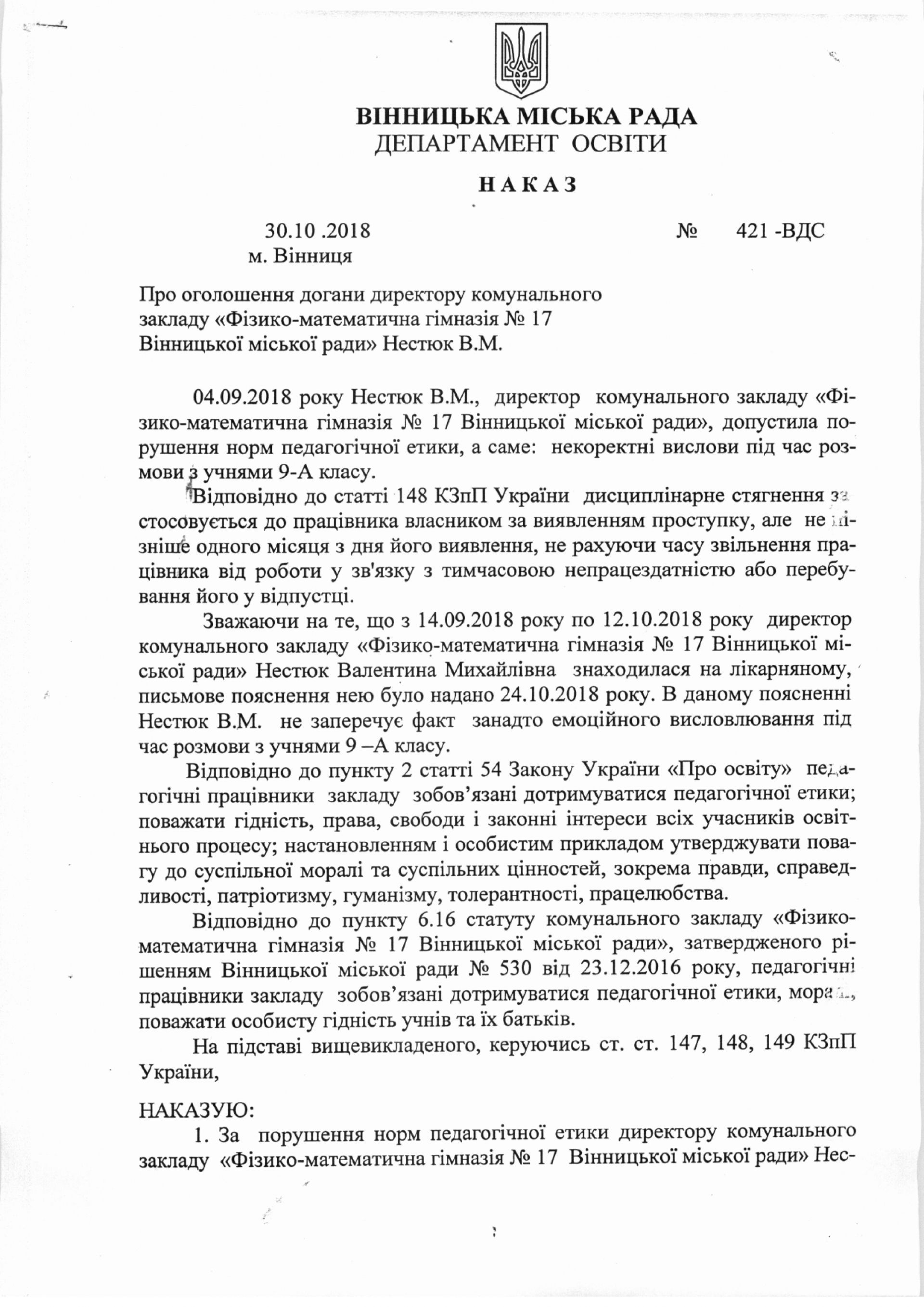 «Допустила порушення норм педагогічної етики, а саме: некоректні вислови під час розмови з учнями 9-А класу», — написано в наказі про догану. Сама Валентина Нестюк надала пояснення про те, що не заперечує це.