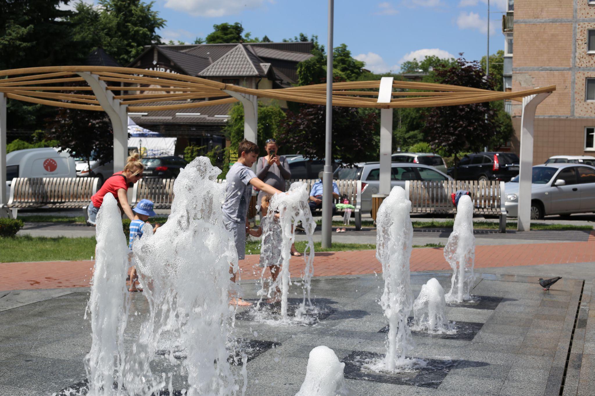 - Разом з батьками граються під струменями водограю поблизу пам’ятника доблесним захисникам неба, на площі, названій на честь полковника Повітряних сил ЗСУ Костянтина Могилка.