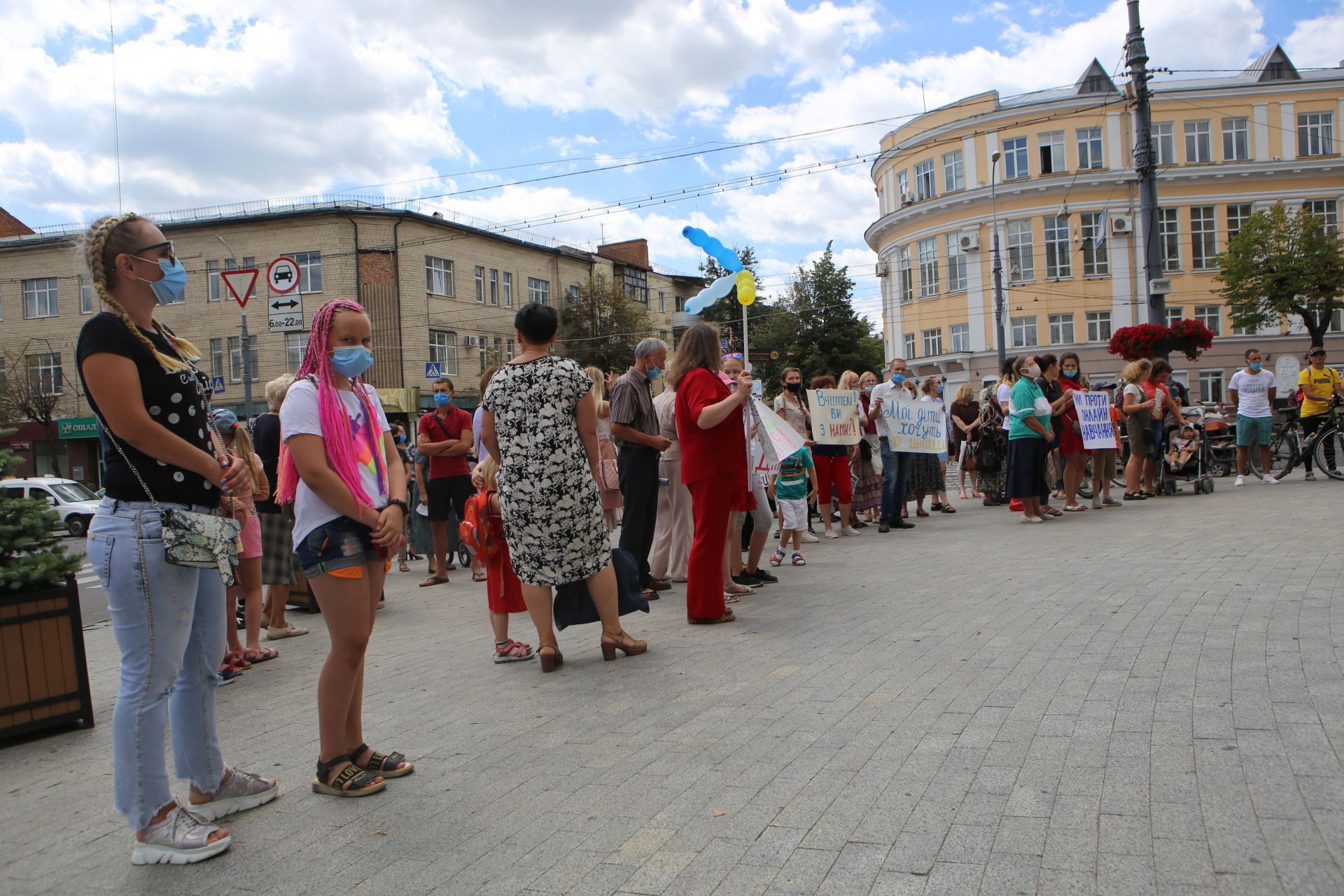 Сьогодні, 22 липня, під стінами ОДА зібралося понад півсотні вінничан, які прийшли з вимогою до влади про повне припинення дистанційного навчання у школах з нового навчального року. Серед присутніх були не лише батьки, але й діти, а також дідусі з бабусями школярів і вчителі вінницьких шкіл.