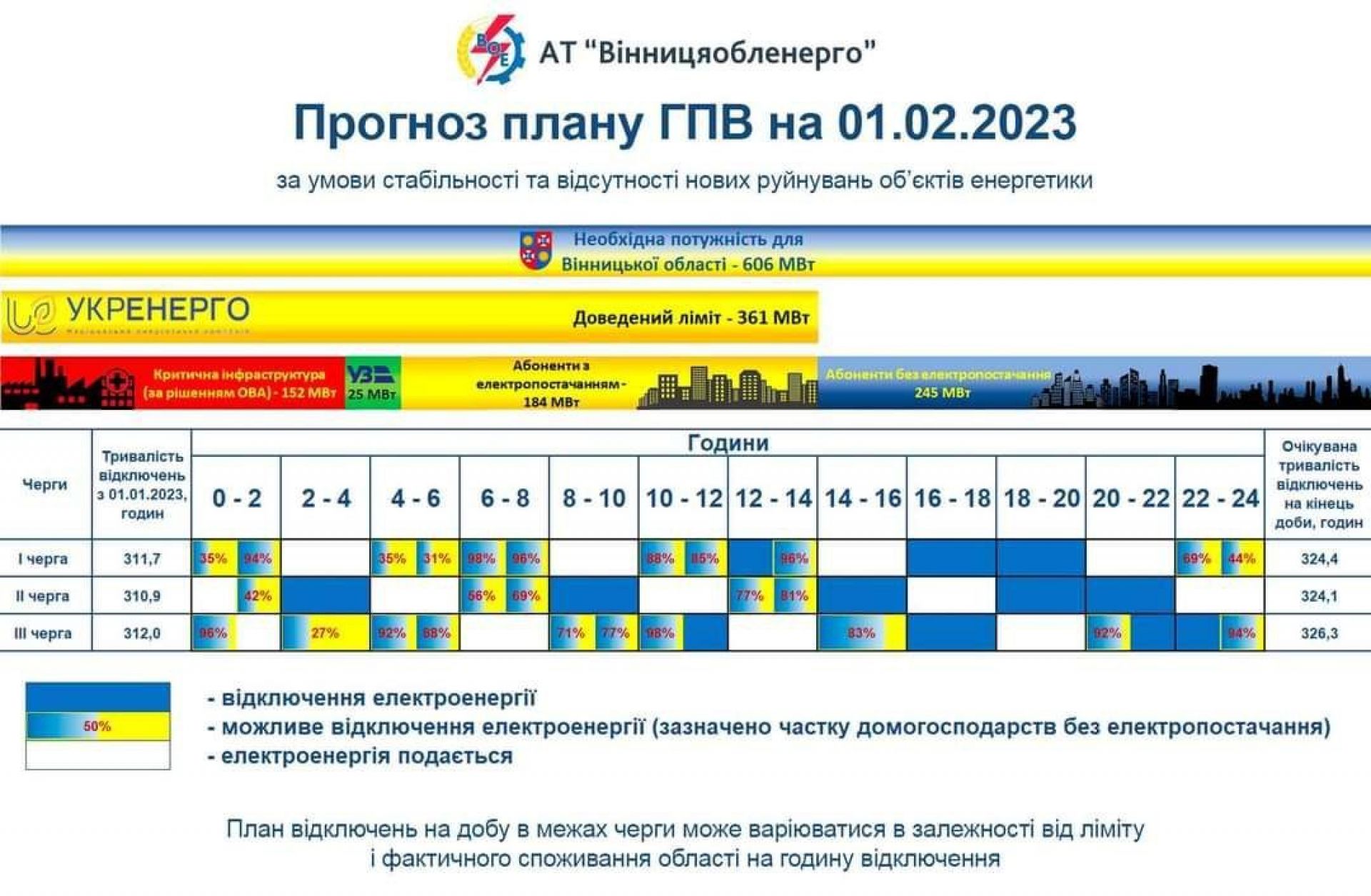 Як повідомляє «Вінницяобленерго», графік погодинних відключень світла до 10 лютого виглядає наступним чином (за умови стабільності та відсутності нових руйнувань об’єктів енергетики).