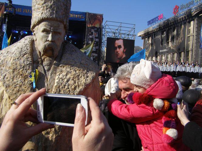 Сотні людей фотографувалися на фоні постаті Кобзаря.У той день Майдан був переповнений людьми.
