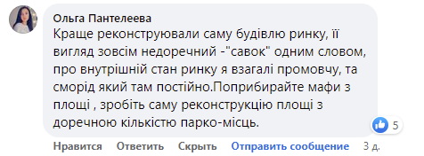 «Краще реконструювати саму будівлю ринку, її вигляд зовсім недоречний — «совок» одним словом. Про внутрішній стан ринку я взагалі мовчу, та сморід там який постійно. Поприбирайте МАФи з площі, зробіть реконструкцію площі (перед ринком - авт.) з доречною кількістю паркомісць», — пише Ольга Пантелєєва.