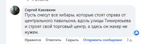 «Нехай знесуть всі халупи, які стоять праворуч від центрального павільйону, по Тимірязєва. І там будують собі торговельний центр. А тут він нікому не потрібен», — пише Сергій Каковкін.