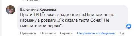 «Проти ТРЦ. Їх вже забагато у місті. Ціни там не по кишені, а розваги… Як казала моя тьотя Соня: «Не смешите мои нервы», — пише Валентина Ковальова.
