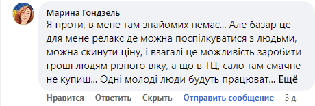 «Я проти. Базар, для мене, це релакс, де можна поспілкуватися з людьми, можна скинути ціну, і взагалі — це можливість заробити гроші людям різного віку, а в ТЦ одні молоді люди будуть працювати. А де працювати людям поважного віку?», — вважає Марина Гондзель.