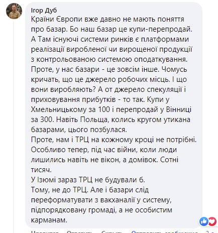 «Країни Європи вже давно не мають поняття про базар. Бо наш базар це купи-перепродай. Купи у Хмельницькому за 100 і перепродай у Вінниці за 300. Навіть Польща, колись кругом утикана базарами, цього позбулася, — пише Ігор Дуб. — Проте, нам і ТРЦ на кожному кроці не потрібні. Особливо тепер, під час війни, коли люди лишились навіть не вікон, а домівок. Сотні тисяч. У Ізюмі зараз ТРЦ не будували б. Тому, не до ТРЦ. Але і базари слід переформатувати з вакханалії у систему, підпорядковану громаді, а не особистим кишеням».