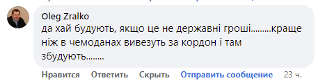 «Нехай будують, якщо це не державні гроші. Це краще, ніж у валізах вивезуть за кордон і там збудують», — пише Олег Зралко.