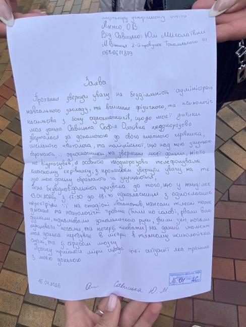 Юлія Савицька також звернулася із заявою до Департаменту освіти Вінницької міської ради. Крім того, жінка записалася на прийом до заступниці міського голови з питань соціального захисту та охорони здоров’я Галини Якубович.