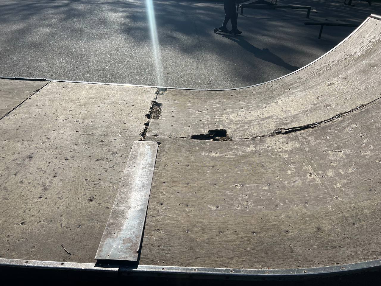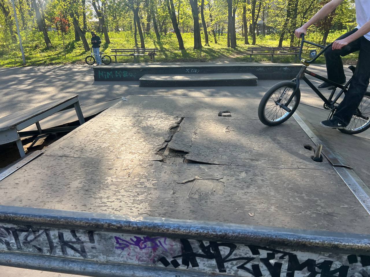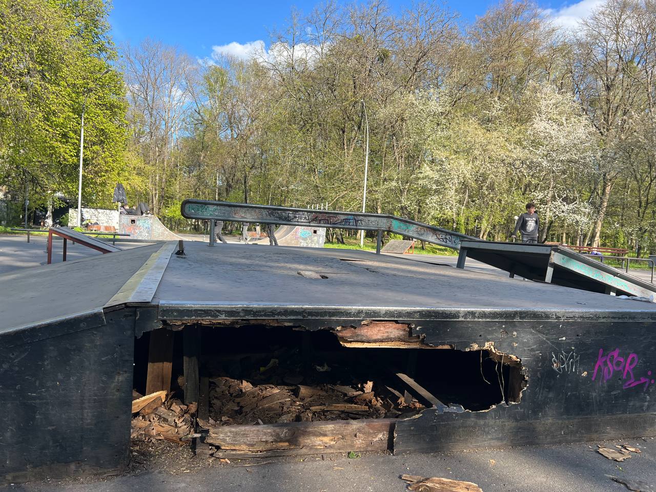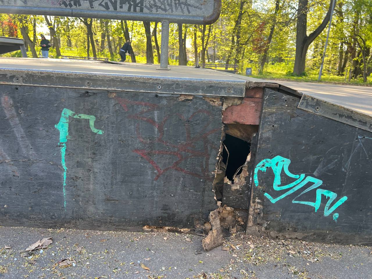 — У нас доволі поламаний скейтпарк. Його ремонтували десь три роки тому, але зараз тут великі дірки на рампах. Щоб закрити найбільшу, ми поставили кікер, але є ще одна дірка, яка не закривається, — розповідає підліток Максим, який регулярно проводить тут час із друзями. — Постійно хтось падає чи дряпається. Ми вже часто просто катаємося по землі, бо фігури стали небезпечними для використання.