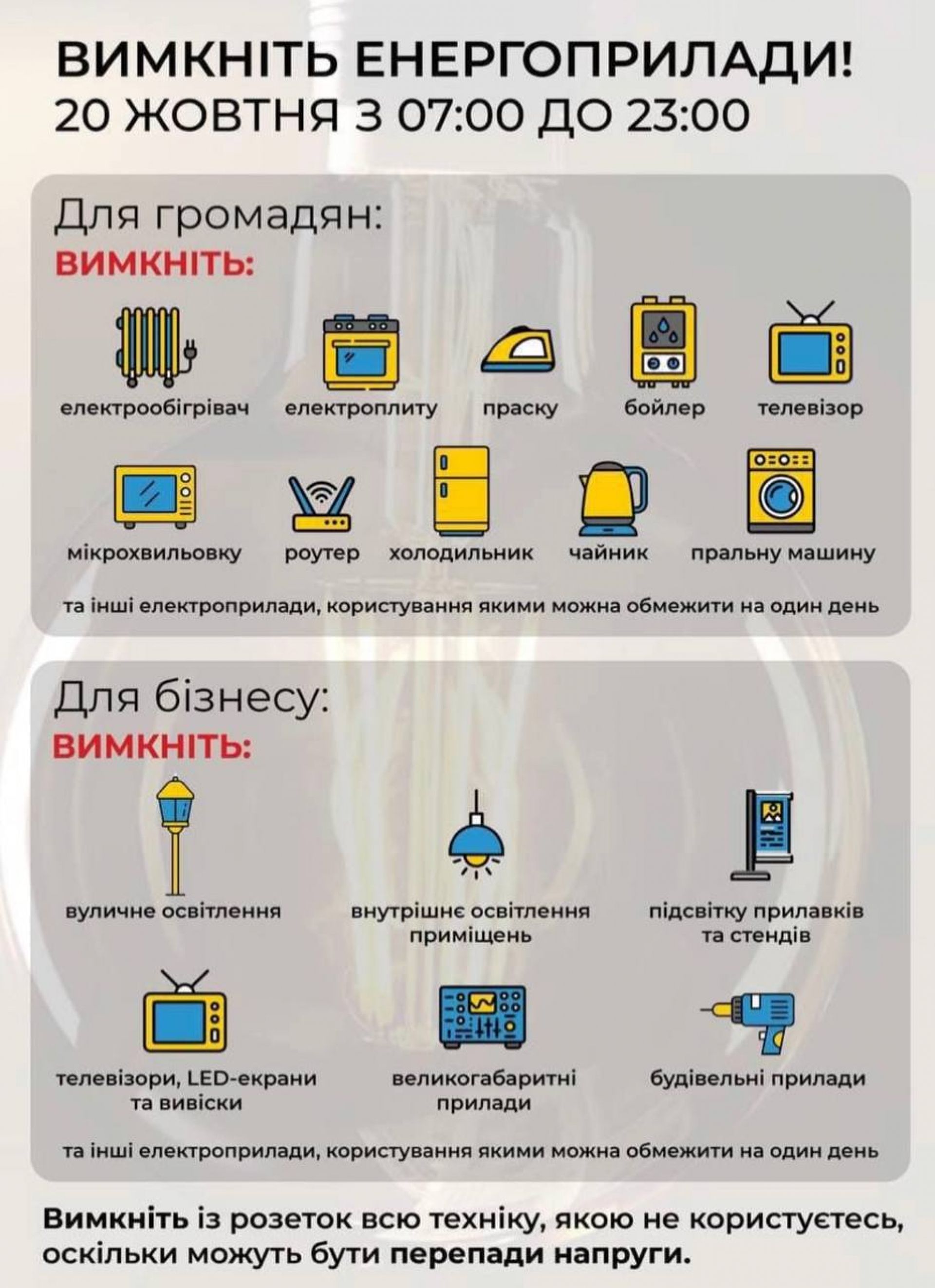 — Починаючи із 7.00 до 23.00 години необхідно мінімізувати користування електроенергією, — наголошують у Вінницькій ОДА. — Це стосується жителів усіх областей країни. Якщо цього не зробити слід готуватися до тимчасових відключень. Це вимушені кроки. Тому всі разом працюємо на своєму фронті!