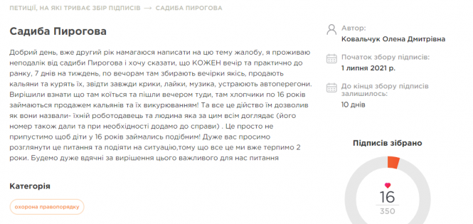 «Я проживаю неподалік від садиби Пирогова і хочу сказати, що кожен вечір та практично до ранку, 7 днів на тиждень, по вечорам там збирають вечірки якісь, продають кальяни та курять їх, звідти завжди крики, лайки, музика, влаштовують автоперегони», — зазначає авторка петиції вінничанка Олена Ковальчук.