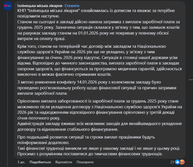 За попередніми прогнозами адміністрації, виплата заборгованості за грудень 2025 року стане можливою після укладення договору з НСЗУ та надходження фінансування — орієнтовно у третій декаді січня.