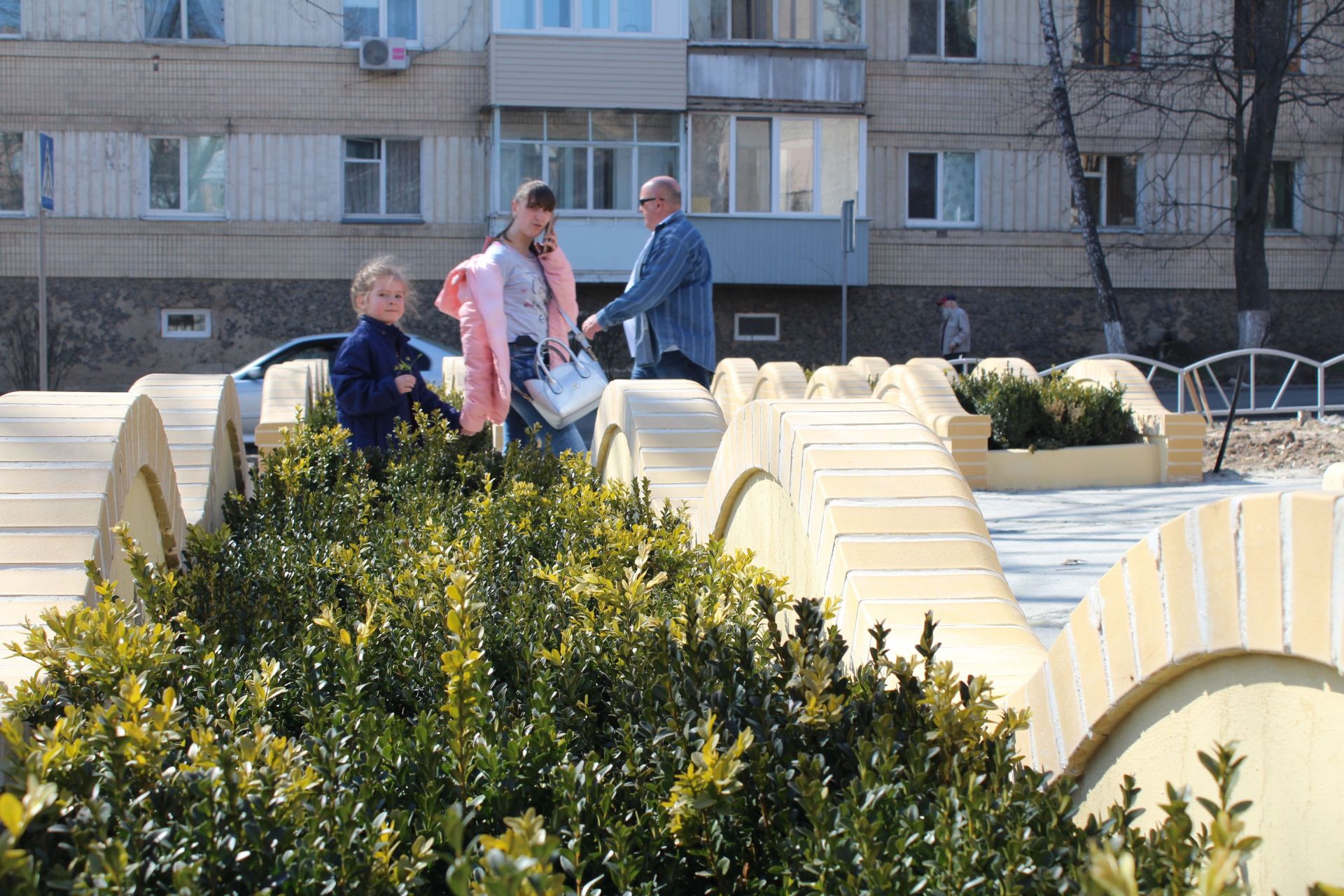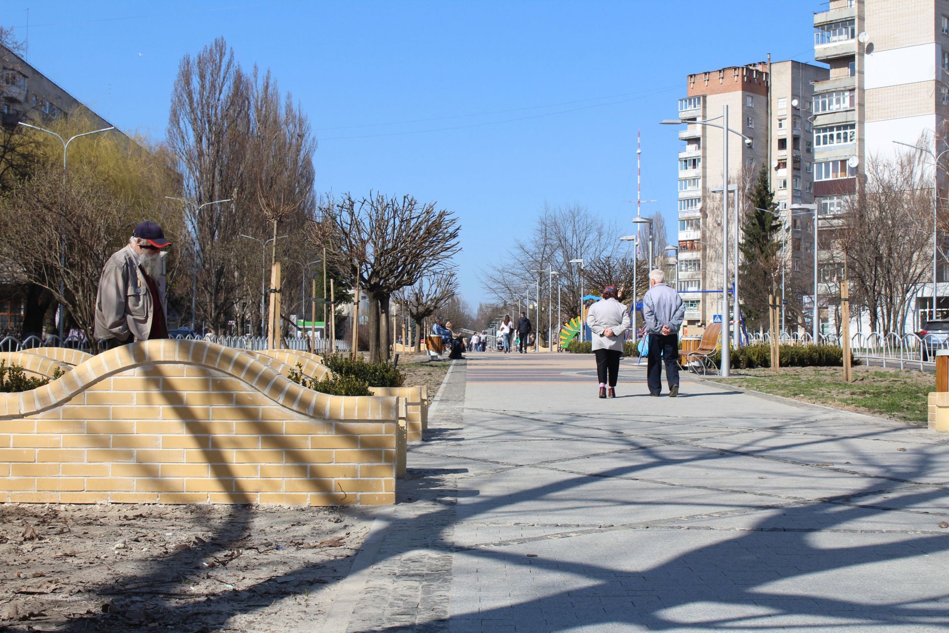 Разом зі звичайними лавками, на цій частині бульвару поставили лавку-«листок», на якій полюбляють лазити діти. І трохи подалі — незвична конструкція, вхід до якої обмежили червоними стрічками. Поки що незрозуміло, що це таке.
