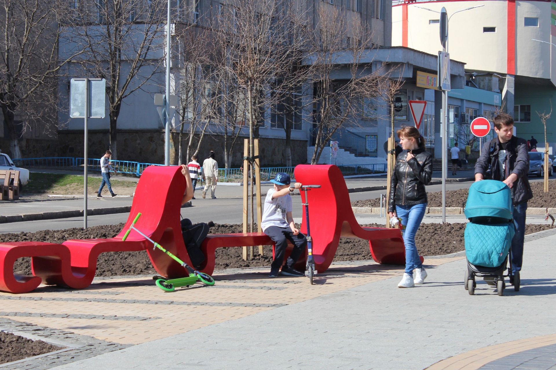 Після неї – чергові вуличні меблі: «хвилясті» лавки та червоні «лежанки» з пластику.