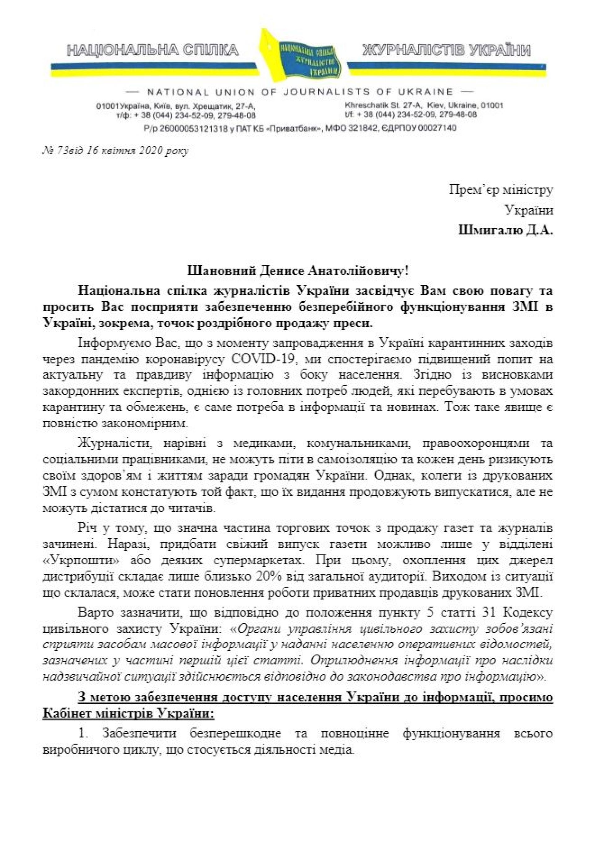 У четвер, 16 квітня, Національна спілка журналістів України звернулася з офіційним листом до прем’єр-міністра України Дениса Шмигаля з проханням посприяти забезпеченню безперебійного функціонування друкованих ЗМІ в Україні, зокрема, роботі точок роздрібного продажу преси. Про це передають на сайті НСЖУ.