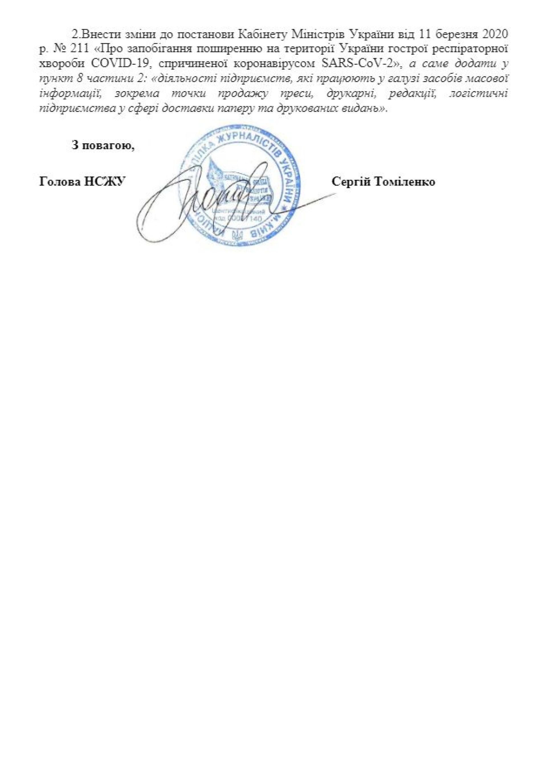 З метою забезпечення доступу населення України до інформації, Національна спілка журналістів України закликає внести зміни до постанови Кабміну №211, а саме додати «підприємства, які працюють у галузі засобів масової інформації, зокрема точки продажу преси, друкарні, редакції, логістичні підприємства у сфері доставки паперу та друкованих видань» у перелік виключень.