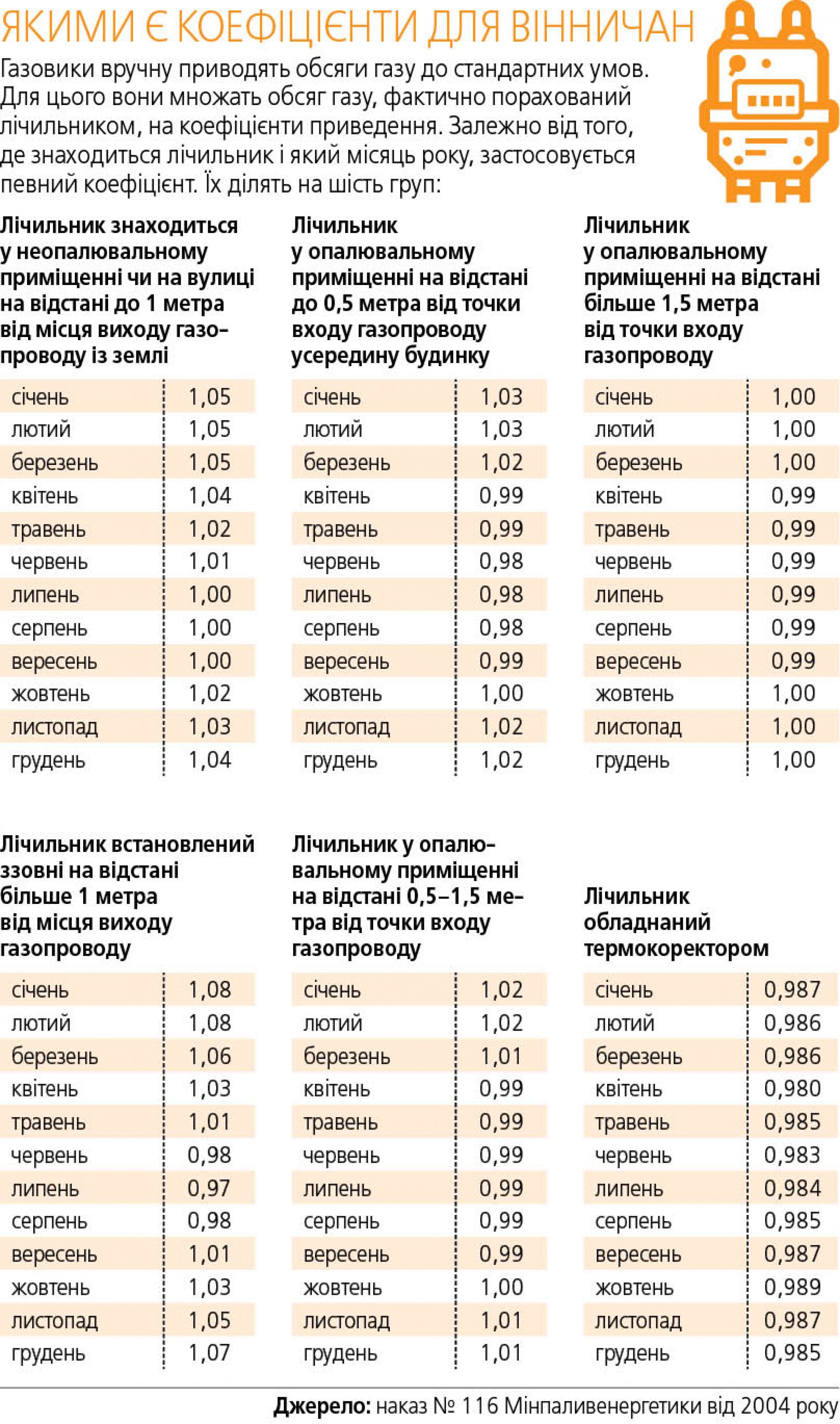 У облгазі роз’яснюють, що найбільший коефіцієнт у січні та в лютому — 1,08. А от якщо лічильник стоїть в опалювальному приміщенні, то коефіцієнт коливатиметься від 0,98 до 1,02.