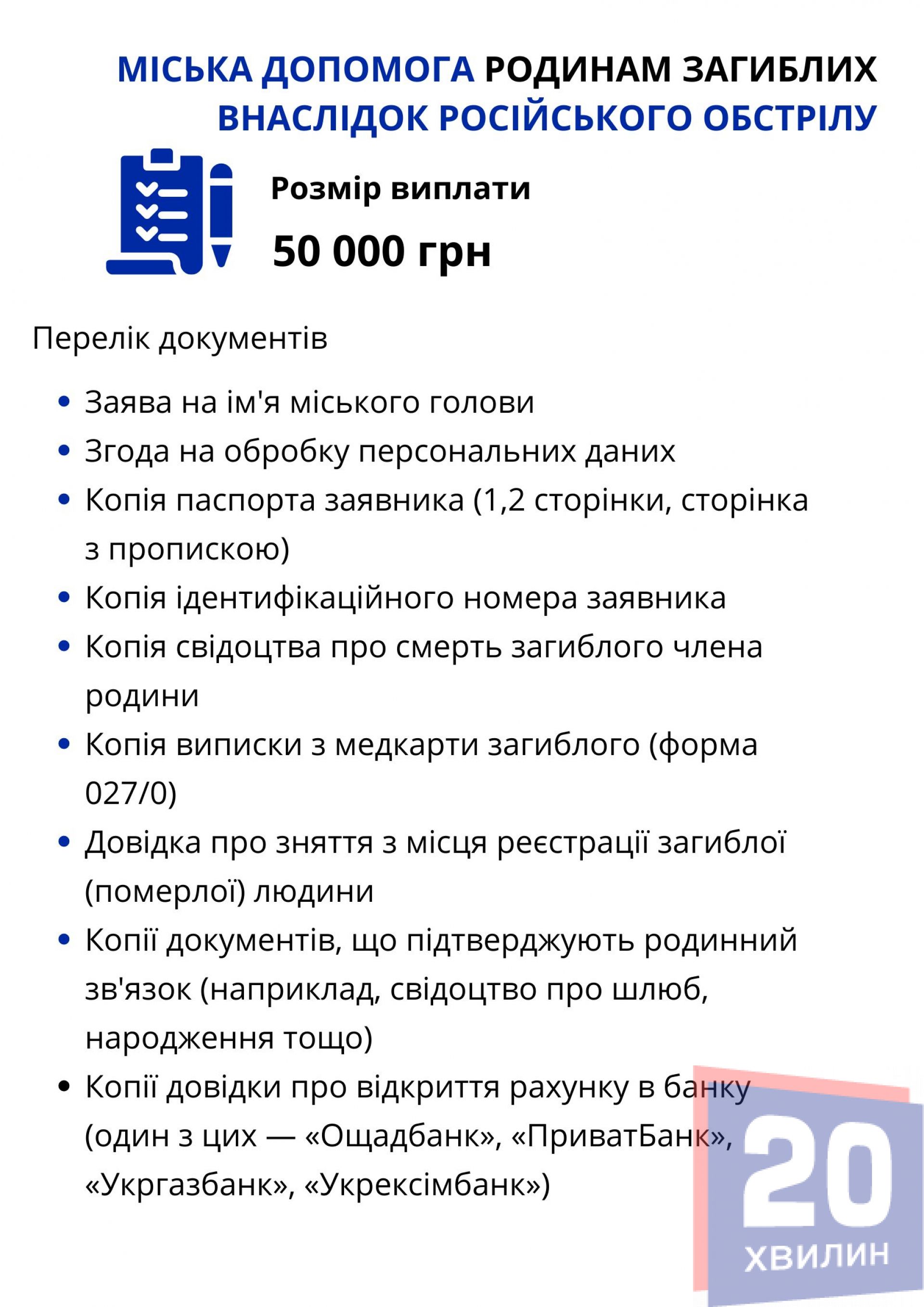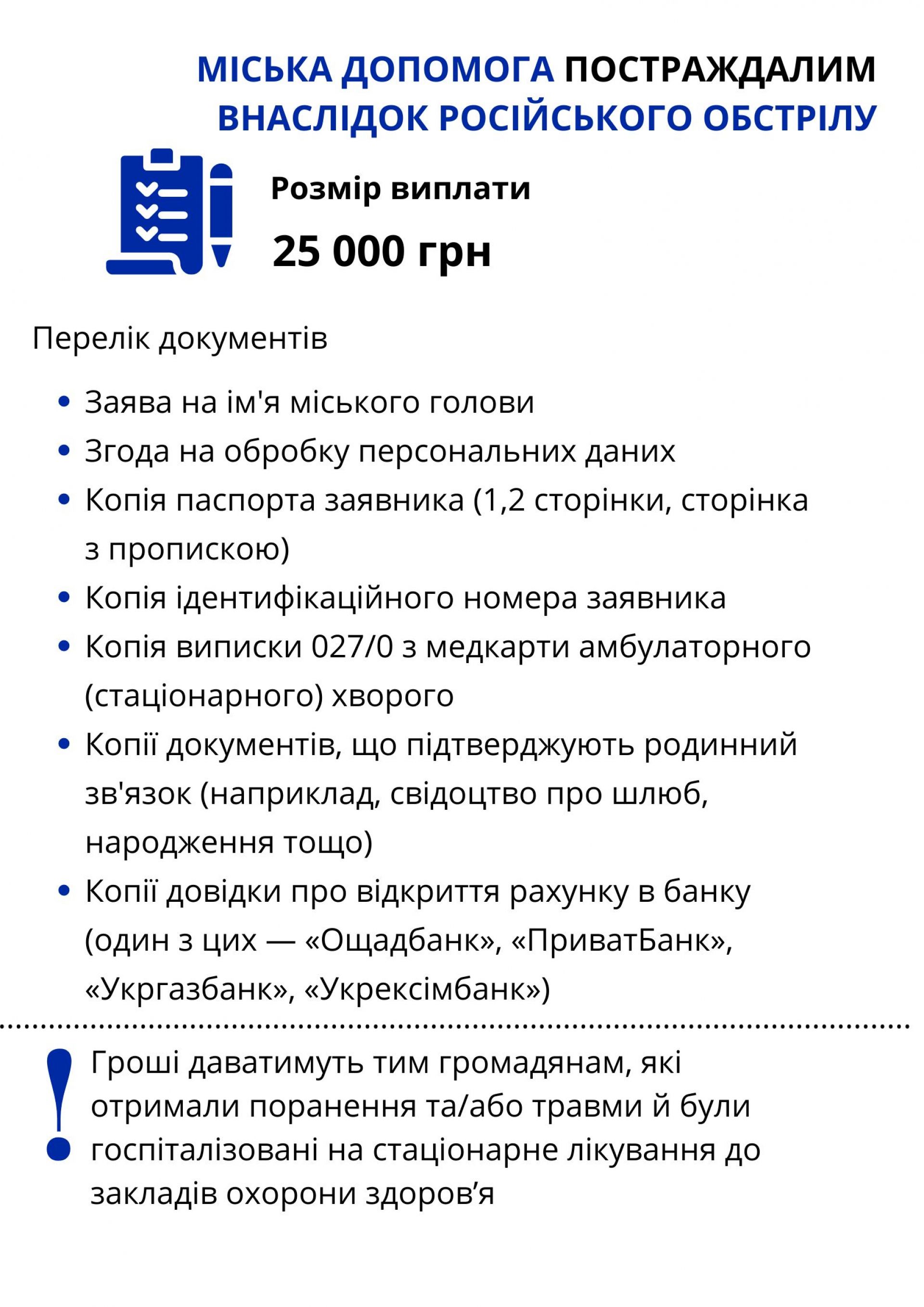 Розмір допомоги аналогічний тому, що є в міській програмі: 50 тисяч для сімей загиблих, 25 тисяч гривень — тим, хто був госпіталізований.