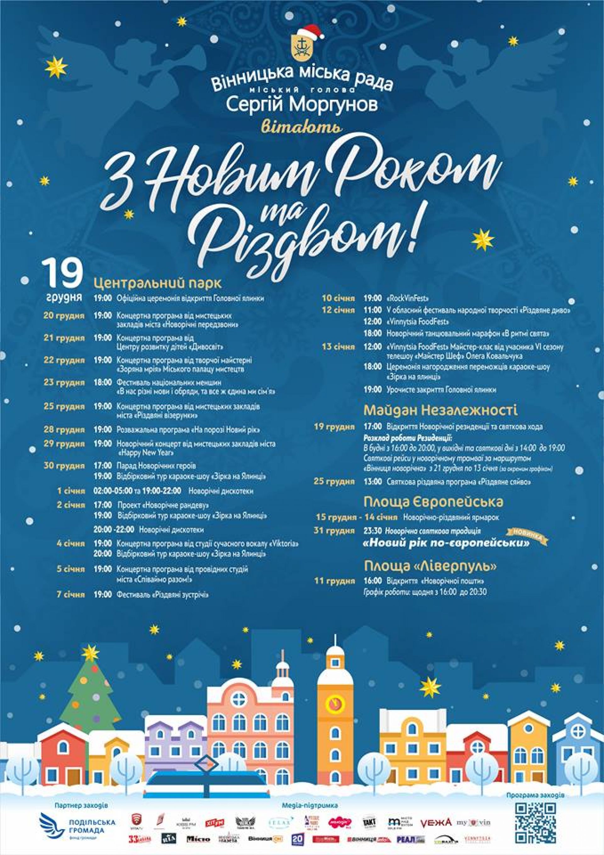 - 14,21,28 грудня та 4 січня — квести для дітей «Таємниці новорічної Вінниці», що будуть проводитися на Соборній, Європейській площі та в Центральному парку.