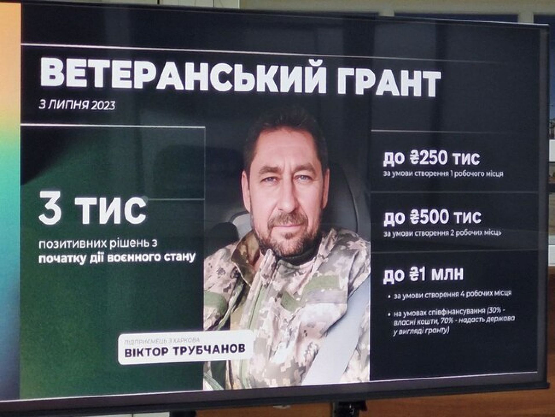 Окремий напрям — ветеранські гранти. За словами керівниці служби, вони передбачають суттєвіші суми підтримки: до 250 тисяч гривень за умови створення одного робочого місця, до 500 тисяч — за два робочих місця та до 1 мільйона гривень — за створення чотирьох робочих місць у форматі співфінансування (30% — власні кошти підприємця, 70% — державний грант).