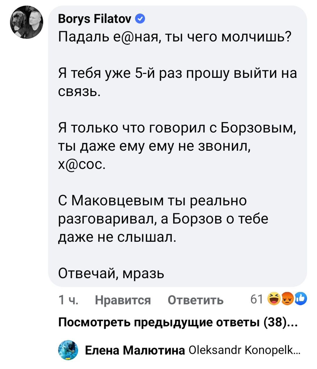 Вже згодом Філатов там саме під дописом залишав повідомлення «Подонок, отвечай!», «Падаль е@ная, ты чего молчишь?» та інші коментарі.