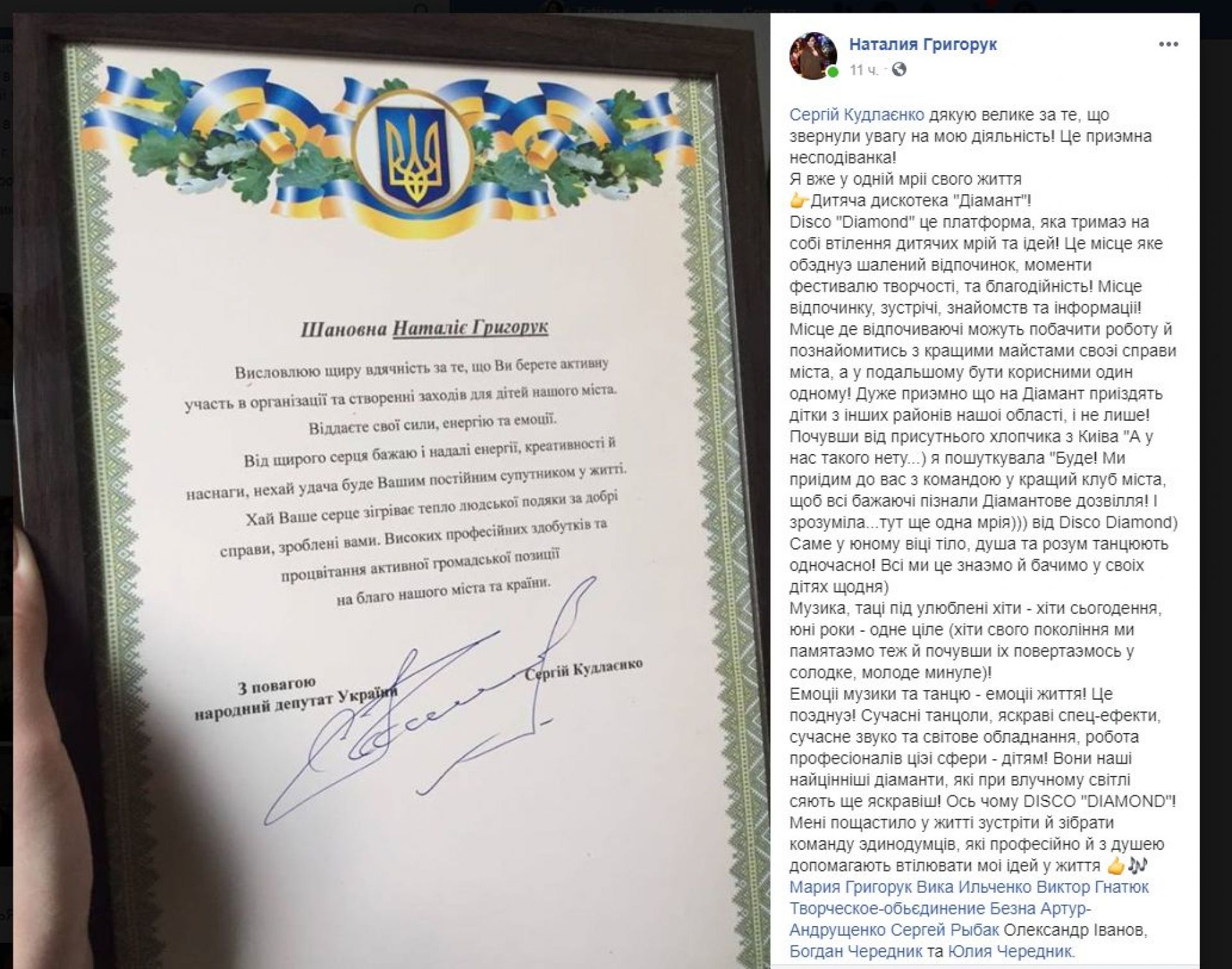 «Сергію Кудлаєнко, дякую велике за те, що звернули увагу на мою діяльність. Це приємна несподіванка. Disco"Diamond" - це платформа, яка тримає на собі втілення дитячих мрій та ідей. Це місце, яке об’єднує шалений відпочинок, моменти фестивалю творчості та благодійність. Місце зустрічі, знайомств та інформації. Місце, де відпочиваючі можуть познайомитись з кращими майстрами своєї справи міста, а надалі бути корисними одне одному. Дуже приємно, що на “Діамант” приїздять дітки з інших районів нашої області, і не лише», - розповідає організатор заходу Наталія Григорук.