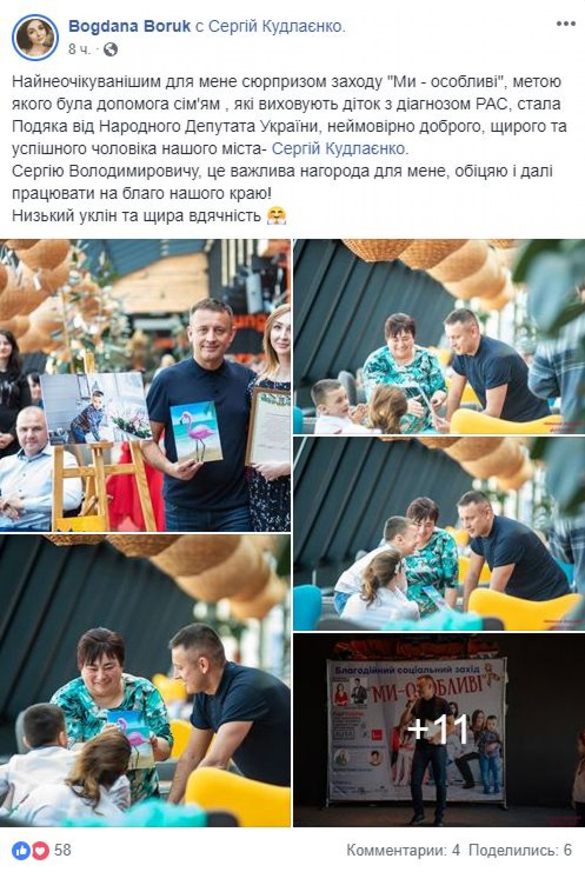 І остання Добра Справа від народного депутата в цей день - підтримка Благодійного соціального заходу "Ми - особливі", який організувала Богдана Борук. Цей проект був присвячений сім'ям, які виховують діток з розладом аутистичного спектру. «Благодійний соціальний захід "Ми - особливі". Це надважка та важлива робота, присвячена сім'ям, які виховують діток-янголів з розладом аутистичного спектру (РАС). Якщо раніше втрутитися, то дитину можна підготувати до навчання у школі, а потім і у виші. Деякі особливі дітки здобувають певні професії. Саме тому захід направлений на те, щоб до кінця висвітлити проблему, щоб допомогти не тільки діткам отримати надію на світле майбутнє, а й батькам - прийняти, навчитися жити, розкритися і підтримати одне одного. Впродовж місяця дітки з РАС займалися арт-терапією та малювали картини. Одну з картин "Яскраво рожевий фламінго", який відображає внутрішній світ Матвія - хлопчика з РАС, автором якої він є, придбав народний депутат України - Сергій Володимирович Кудлаєнко. Кошти за картину допоможуть здійснити ще одну мрію Матвійка. Не можу не сказати про щирість та іскри добра в очах Сергія Володимировича при спілкуванні з Матвієм, що є ще одним прикладом того, що, не дивлячись, який ми маємо статус у суспільстві, статус "Людини", так, саме Людини з великої букви зі щирим серцем та доброю душею, може мати кожен. Низький уклін вам, Сергію Володимировичу, за ваше добро, підтримку та віру! Це стимулює, надихає та спонукає йти вперед та робити ще більше на благо нашого краю», - каже Богдана Борук, організатор заходу. Після того, як Сергій Володимирович придбав картину, він поспілкувався з родиною хлопчика і залишив цю роботу Матвію на спогад про сьогоднішній день.