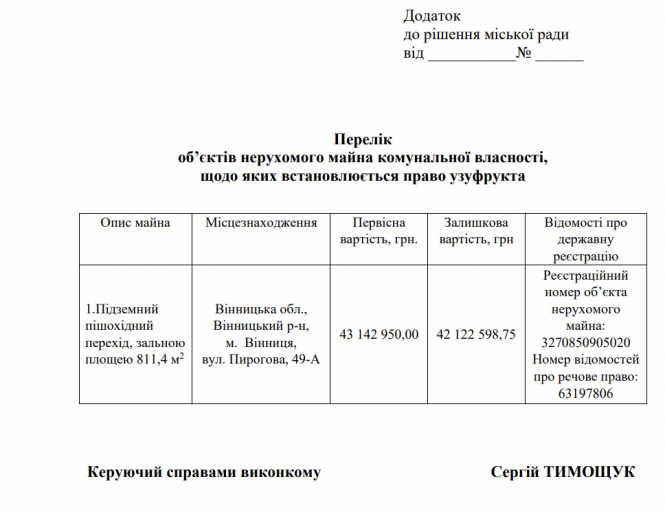 - Виконком Вінниці передав підземний пішохідний перехід на вулиці Пирогова в управління Агенції муніципальної нерухомості.