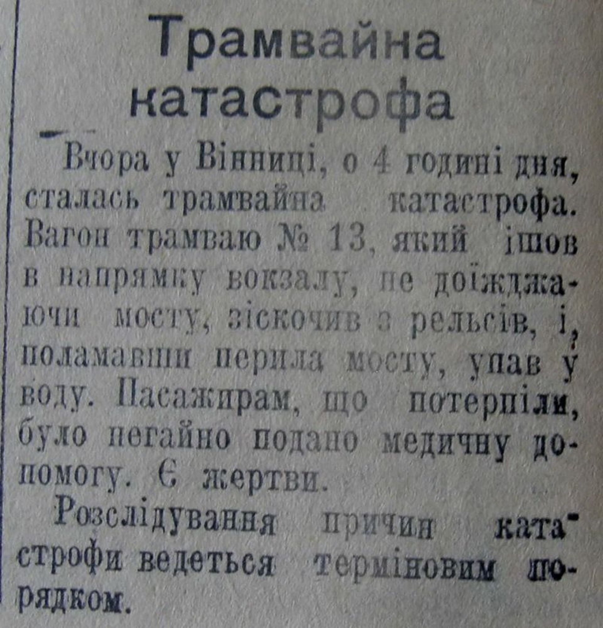 Саме так у тогочасній пресі охрестили цю подію: «8 травня, о 4-й годині дня, трамвай №13, спускаючись вулицею Леніна (Соборна — авт.), розігнався більше дозволеної швидкості та звалився з мосту до Південного Бугу».