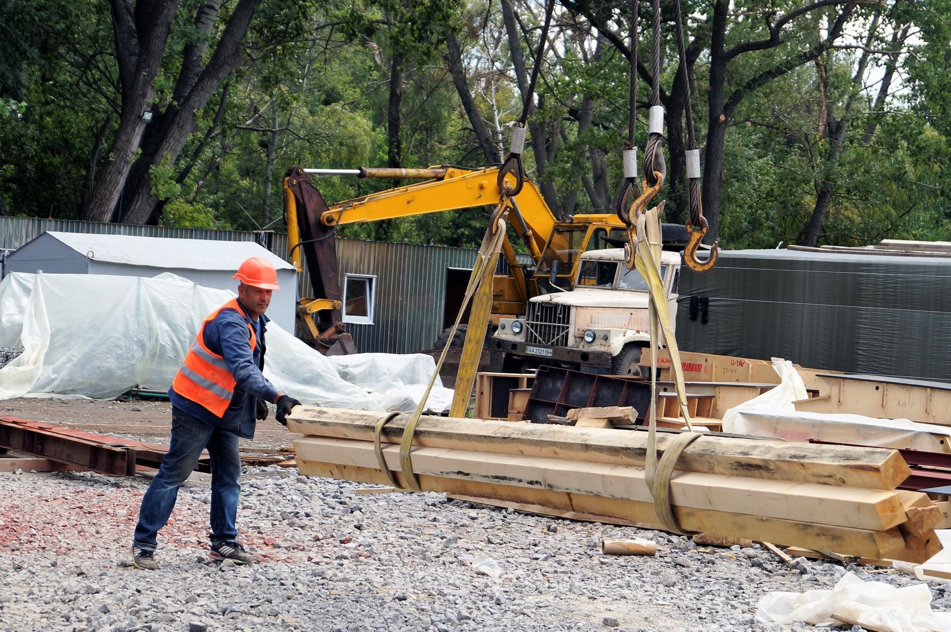 Отже, спускаємося до узбережжя річки, де розташоване містечко будівельників — з десяток вагончиків, склади будматеріалів та кілька машин. Унизу також стоїть ще один автокран. Питаємо, де знайти «старшого». Робочі показують на загорілого чоловіка у джинсах та зеленій жилетці, якого звуть просто «Федорович».