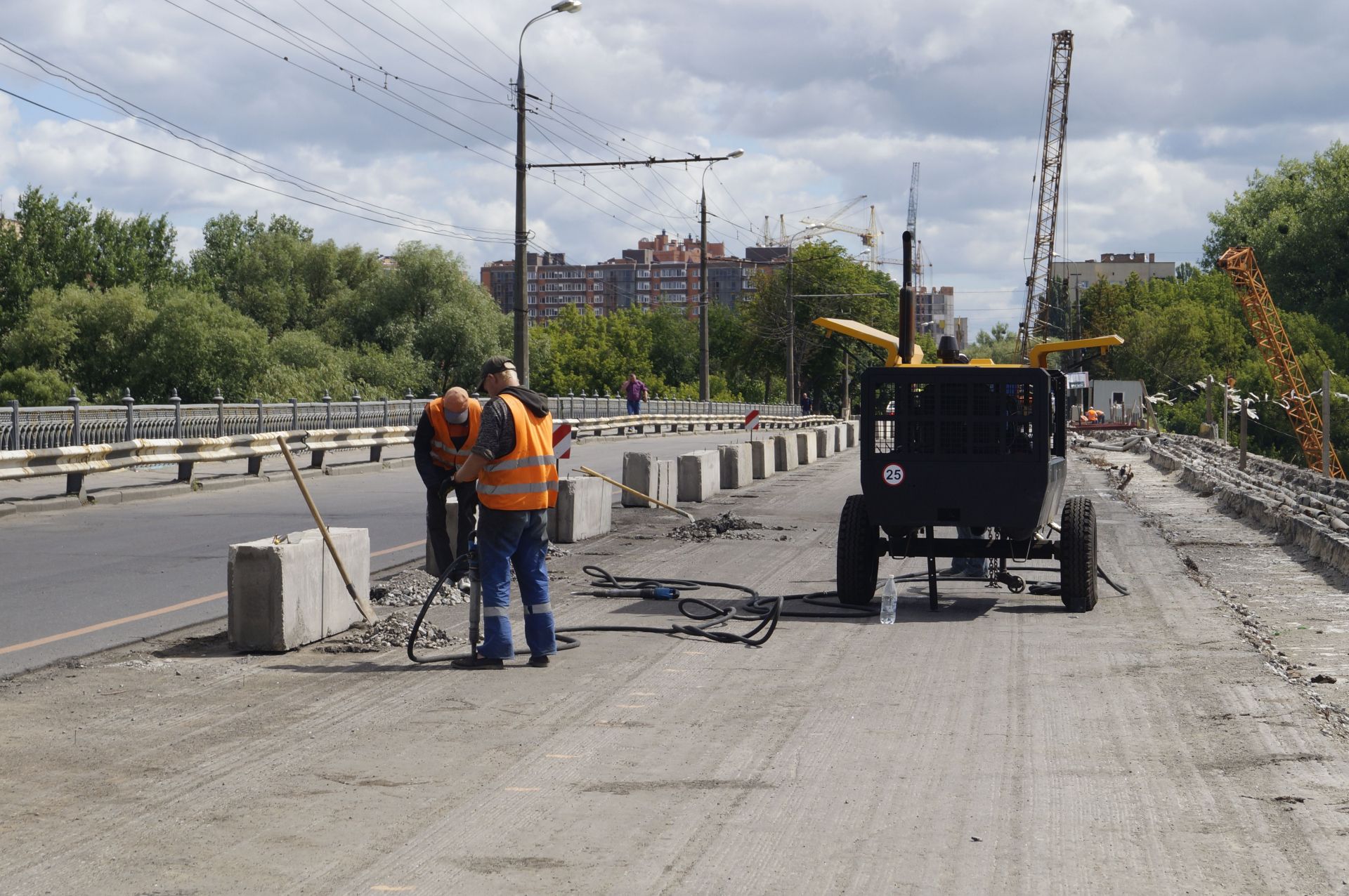 — У березні були підготовчі роботи — монтаж блоків, зняття асфальту, зняли огородження, бордюрні камені. Потім почали переносити комунікації з тротуарної частини. А далі ми зробили перехідні плити по лівій частині мосту та почали свердлити отвори під риштування, по якому знизу ходять люди. Та ще облаштували перехідні плити, так звані заїзди на міст.