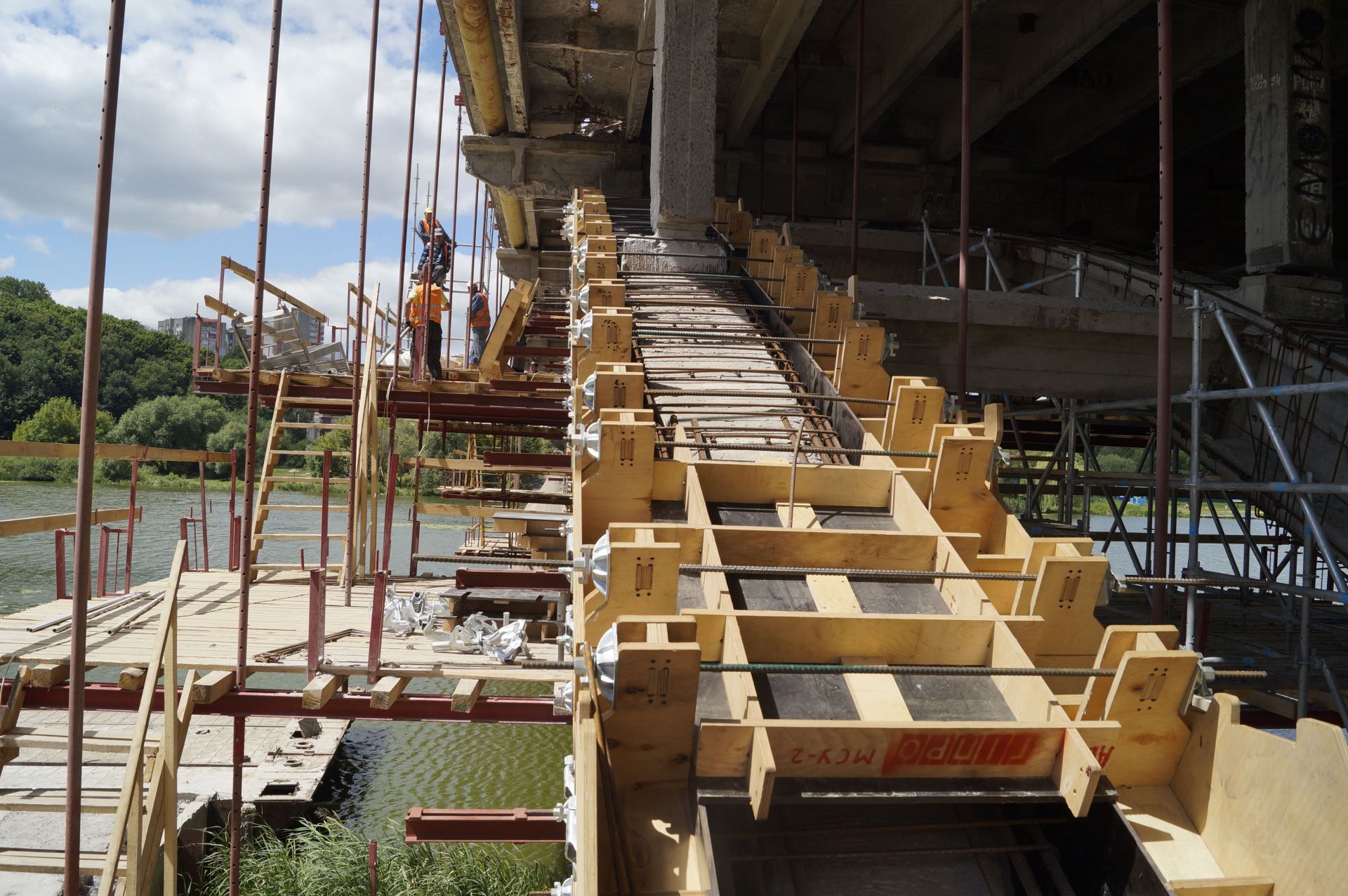 У цій конструкції навколо опори викладена арматура та незабаром почнуть заливати бетон. До десяти робітників стоять на риштуванні та роблять нові опалубки під наступні опори. Як розповів виконроб «МСУ-2» Ярослав Лучечко, зараз готуються укріплювати рігелі та стійки — елементи опорної конструкції мосту.