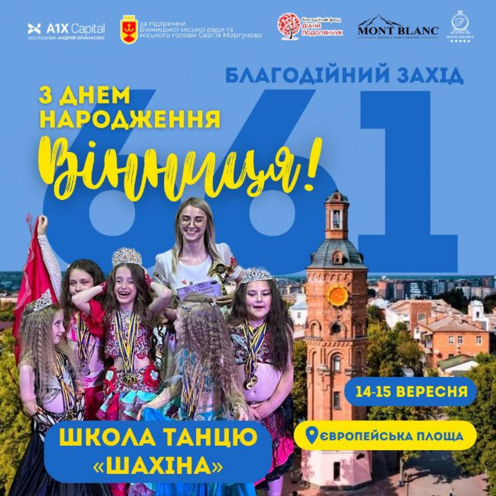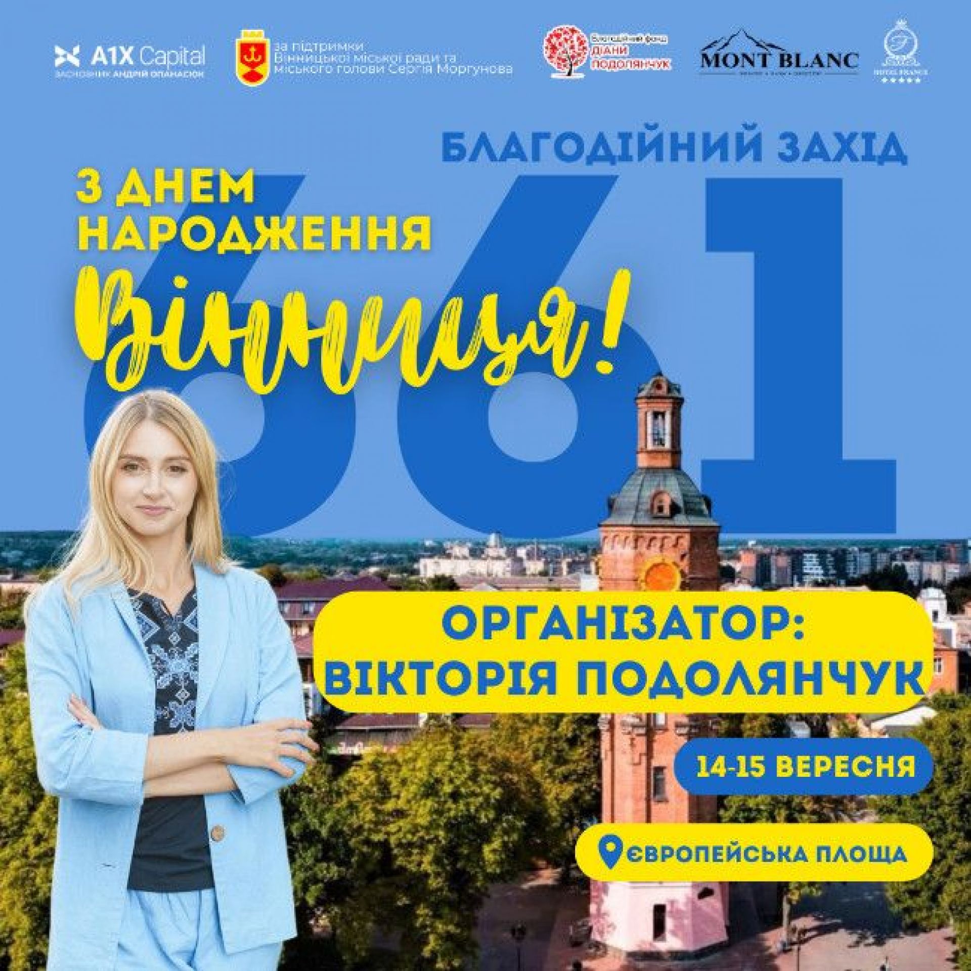 Масштабний благодійний захід з нагоди Дня народження Вінниці проведуть 14-15 вересня на Європейській площі (вулиця Соборна). Співорганізатором заходу виступає Благодійний фонд Діани Подолянчук за підтримки Вінницької міської ради та міського голови Сергія Моргунова.