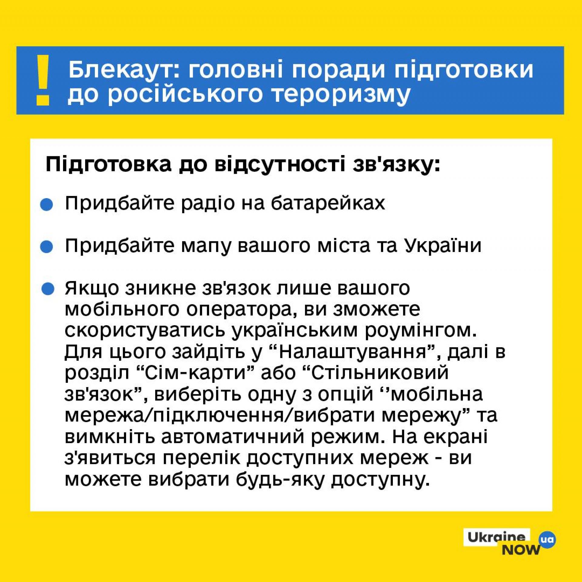 На випадок «блекауту» (масового відключення енергопостачання через аварію - авт.) спільнота державного сайту Ukraine Now підготувала перелік порад, як підготуватись до тривалого відключення енергії.