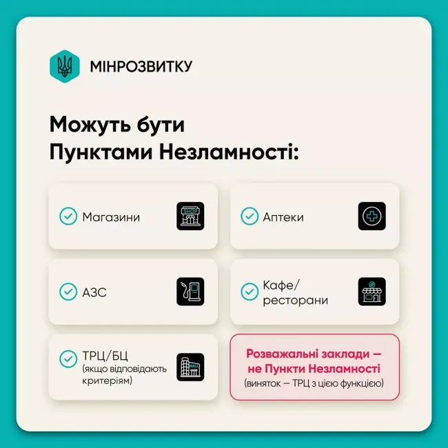 - пунктами незламності можуть бути магазини, аптеки, АЗС, заклади сфери послуг і торговельно-розважальні центри, якщо вони мають: автономне живлення; опалення; стабільний зв'язок; подовжувачі та безкоштовний гарячий чай.