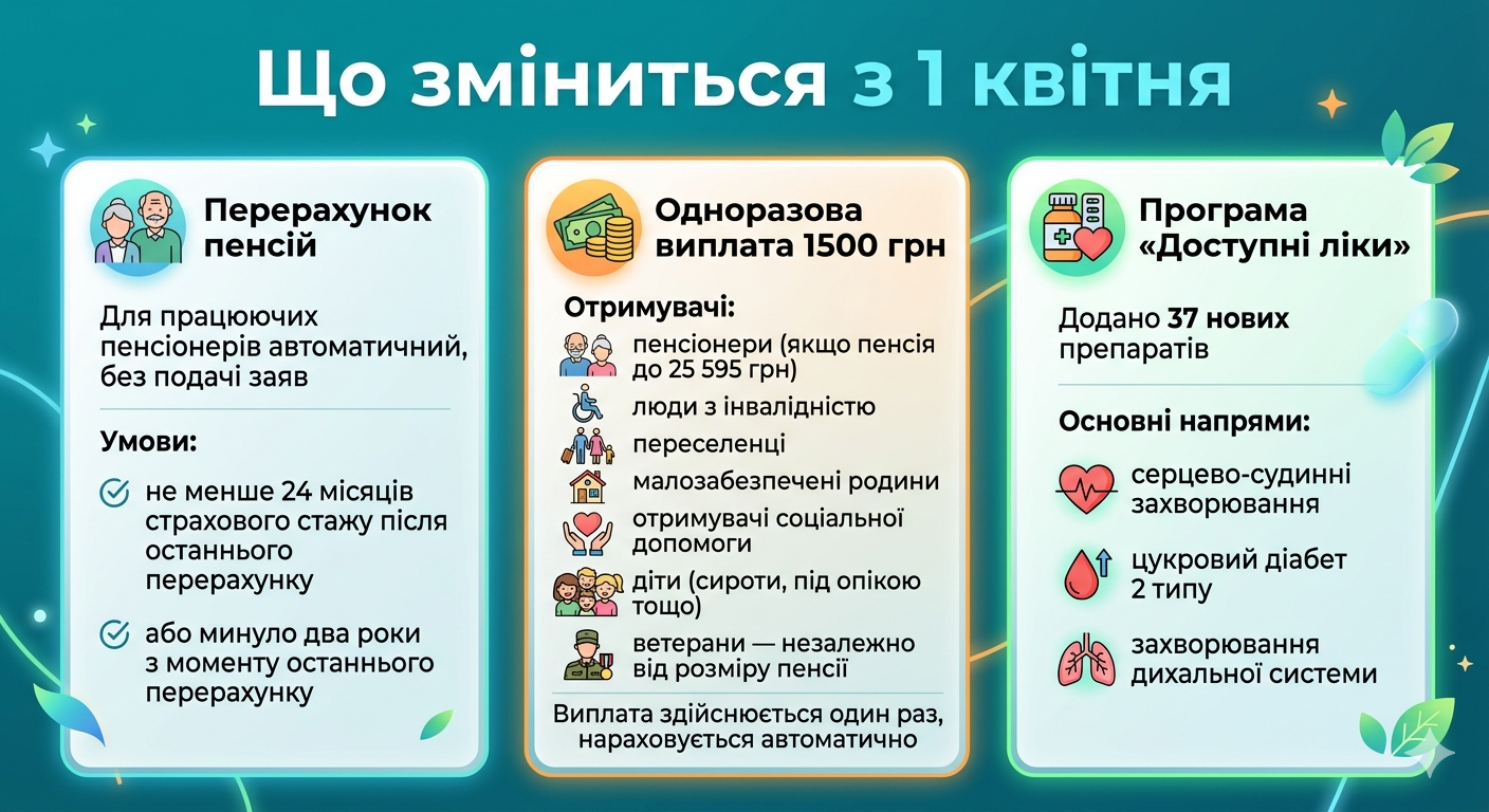 - Квітень принесе вінничанам одразу кілька важливих змін: перерахунок пенсій, доплати, розширення «Доступних ліків».