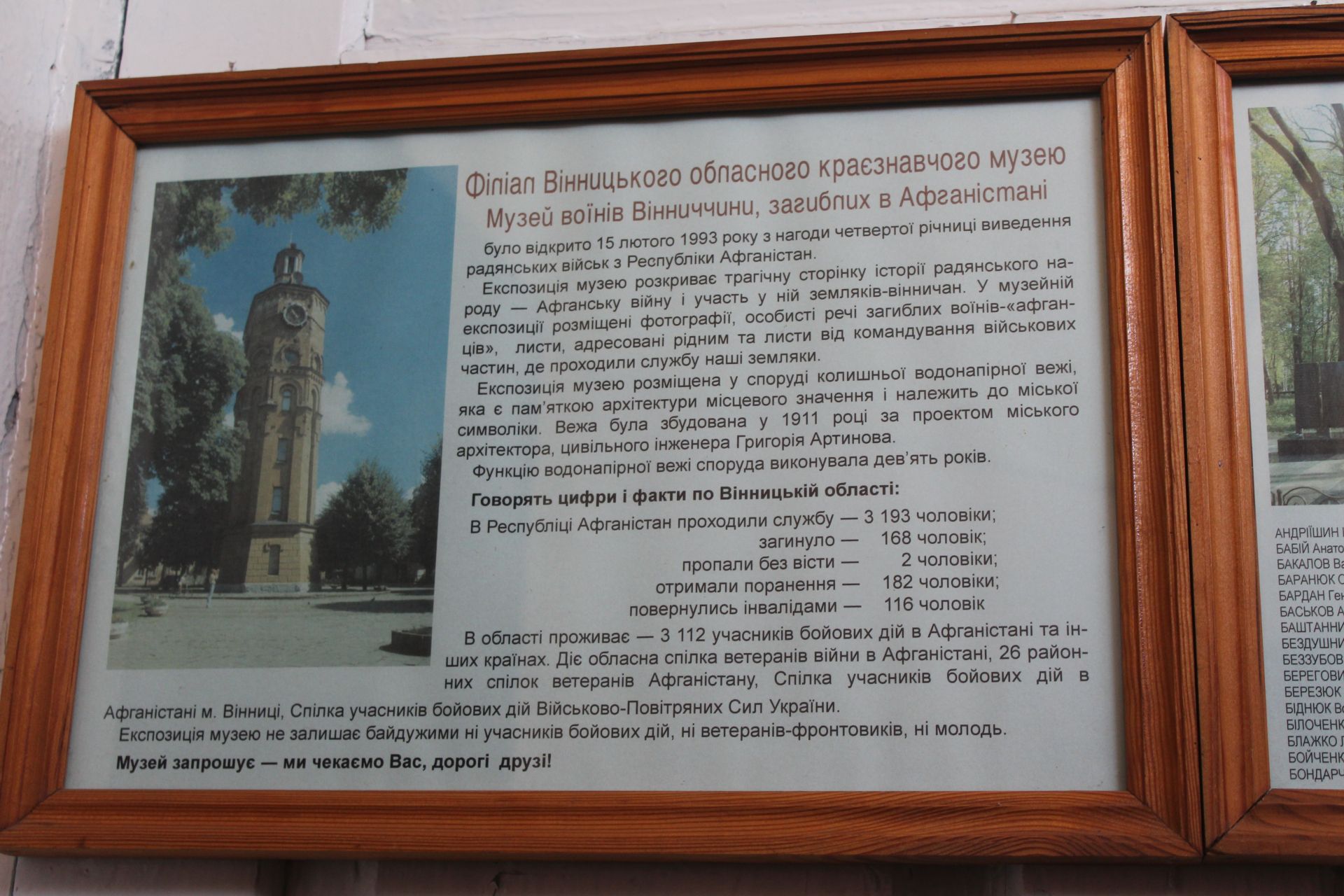 На протилежній стороні від Подільського турцентру вже 28 років працює «Музей пам’яті», присвячений загиблим вінничанам в Афганістані. Його співробітниця, Надія Добровольська, шукала інформацію про башту в архівах: