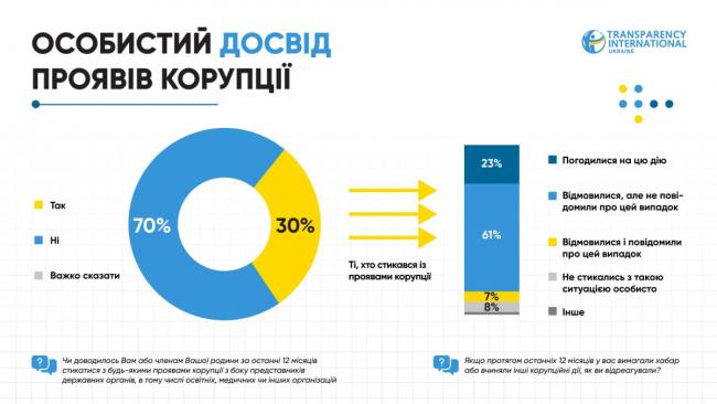 Серед тих, хто стикався з корупцією, 23% погодилися на запропоновану схему, 68% відмовилися, а 7% повідомили про спробу хабарництва.
