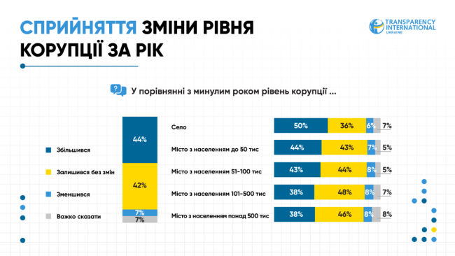 Погляди на динаміку корупції розділилися: 44% респондентів вважають, що її рівень зріс, 42% — що залишився без змін, і лише 7% українців переконані, що рівень корупції зменшився порівняно з минулим роком.