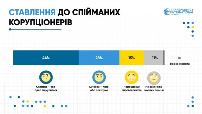 — Корупція залишається однією з ключових проблем для громадян, водночас українці не вірять у реальну ефективність боротьби з нею. Це створює серйозний розрив: суспільний запит на справедливість зростає, але емоційно люди відчувають зневіру та скепсис. Українці небагато знають про вже досягнуті результати, тому відсутність інформації часто сприймається, як відсутність прогресу. Важливо не лише протидіяти корупційним практикам, а і якісно показувати результати цієї боротьби», — зауважує Анастасія Мазурок, заступниця виконавчого директора Transparency International Ukraine з операційної діяльності.