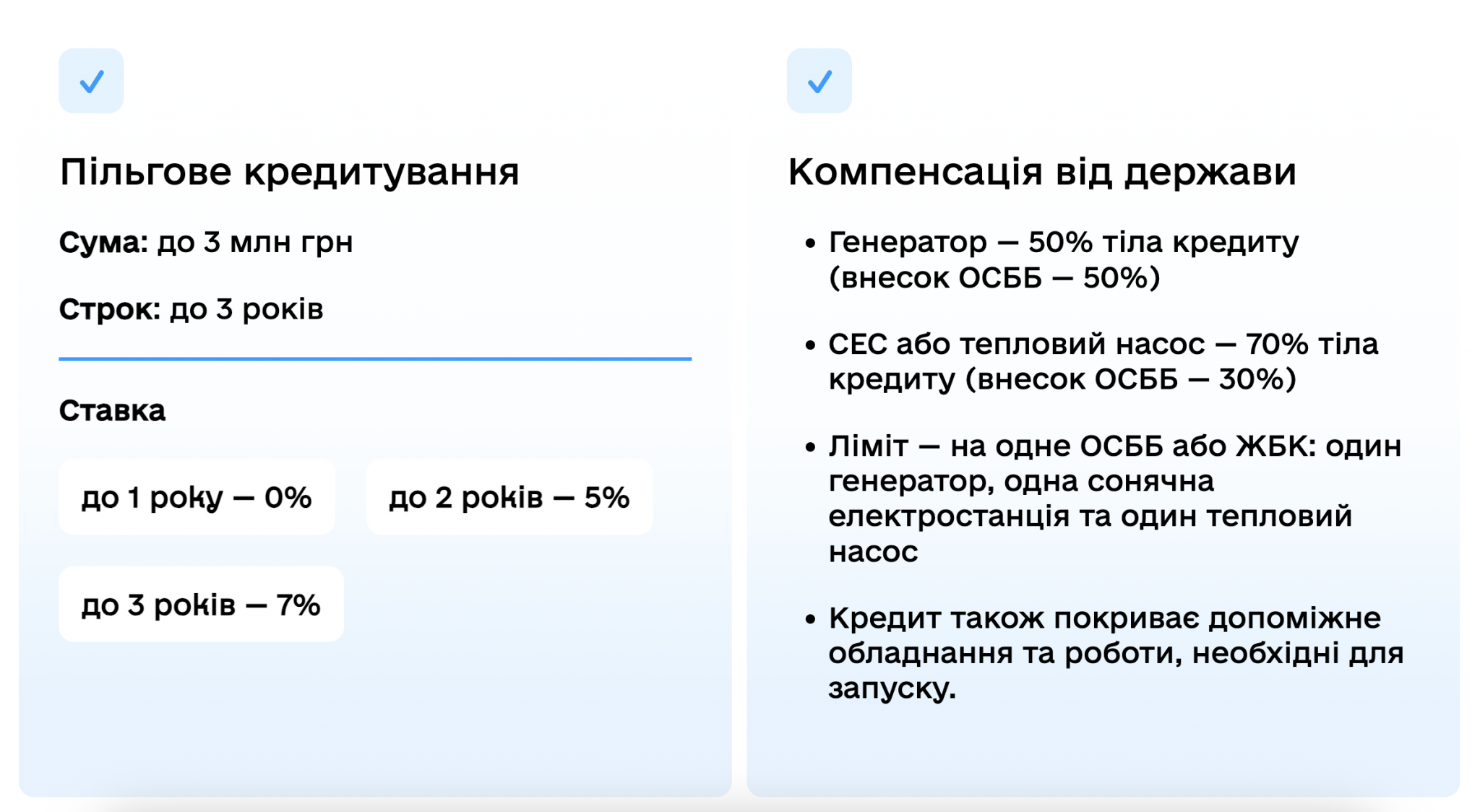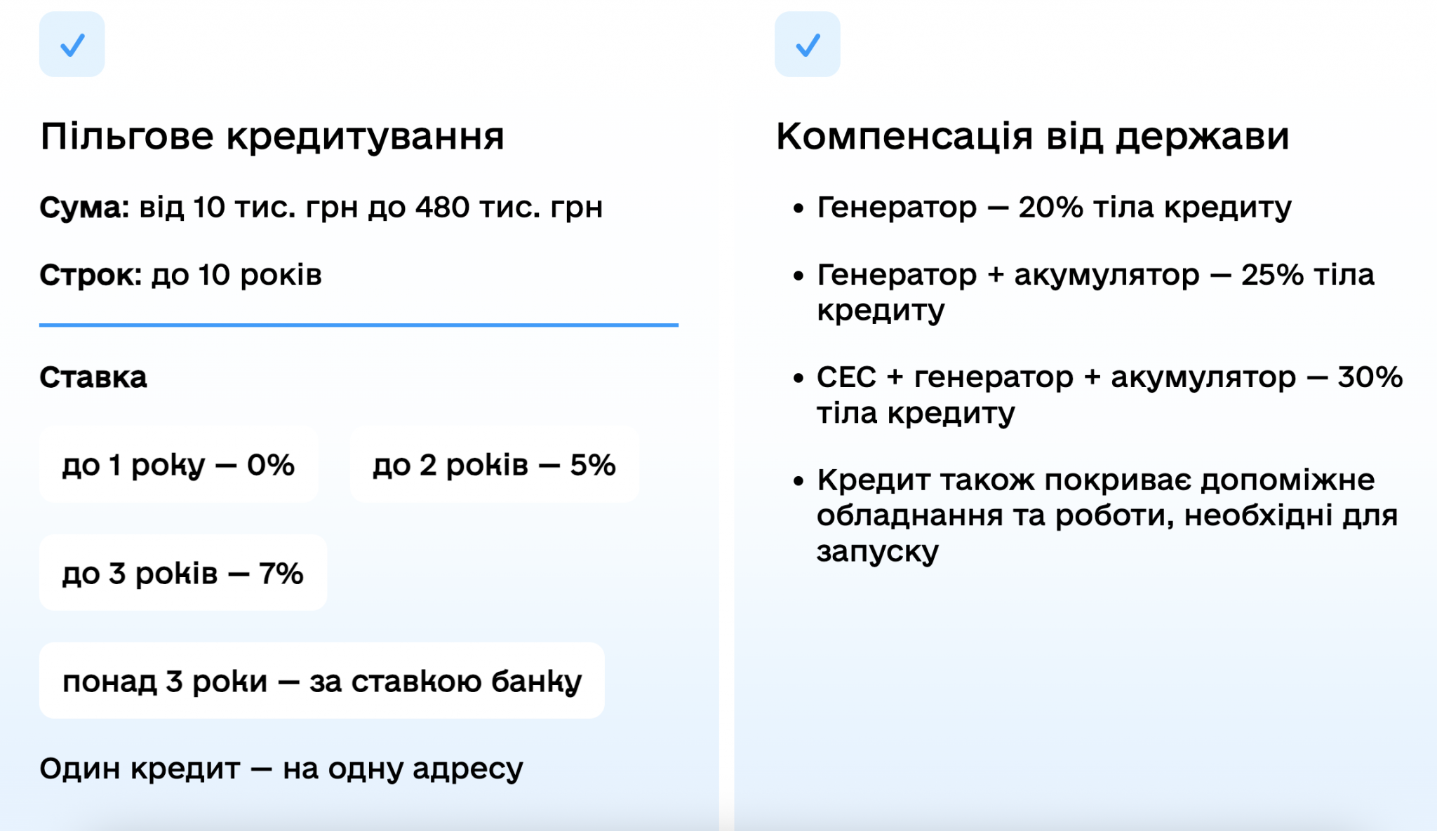 - Мешканці багатоповерхівок та приватних будинків можуть отримати позики на закупівлю генераторів, акумуляторів та навіть сонячних електростанцій.