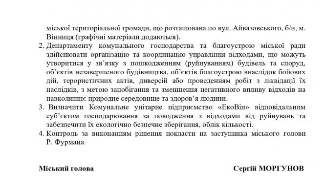 Спецмайданчик функціонуватиме протягом дії воєнного стану та упродовж одного року після його завершення. Департамент комунального господарства та благоустрою координуватиме процес, щоб мінімізувати негативний вплив на навколишнє середовище та здоров’я людей. Відповідальним за поводження з такими відходами та їхній точний облік призначили комунальне підприємство «ЕкоВін».