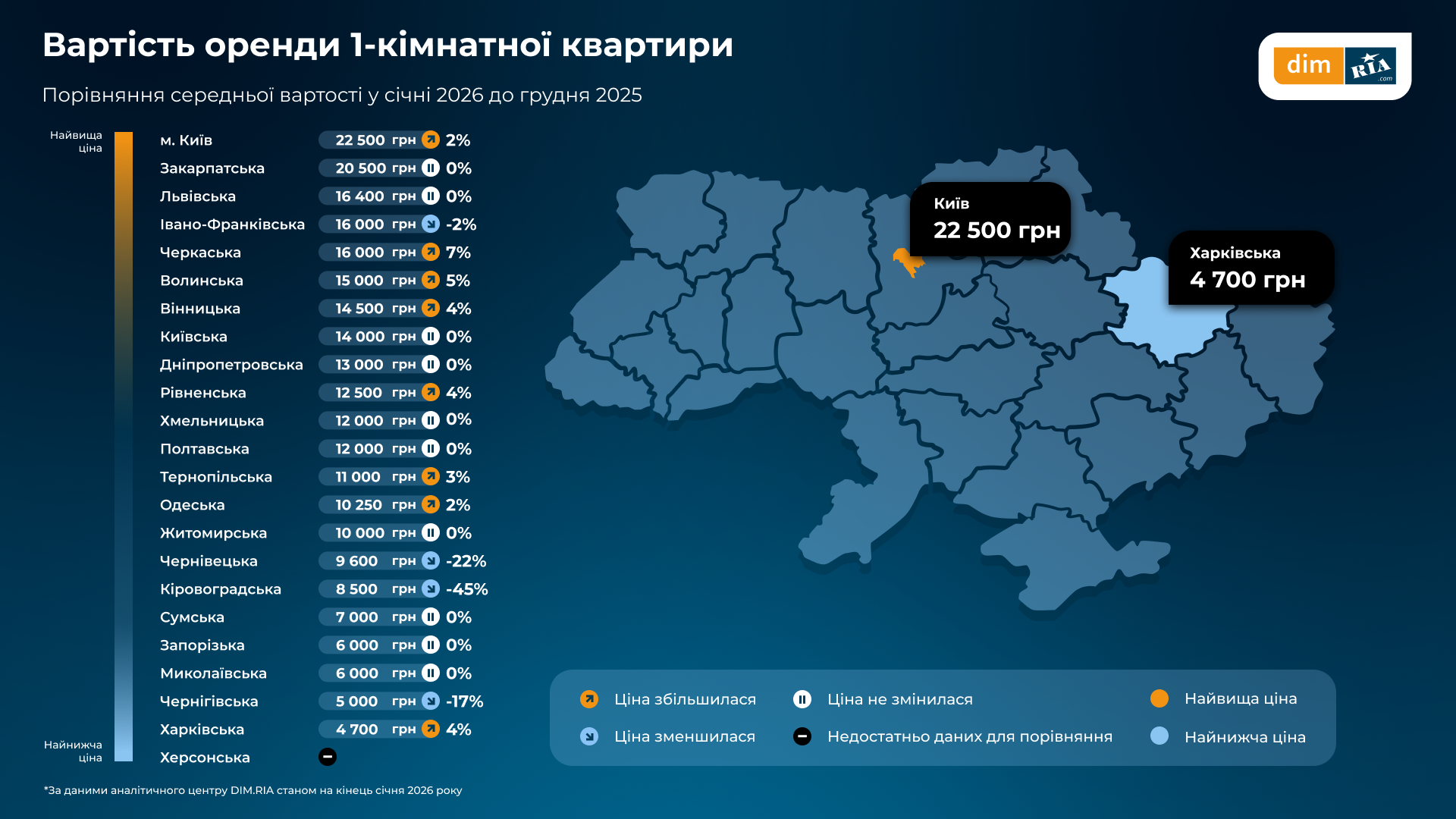 У січні 2026-го Київ знову лідирує за середньою ціною на оренду — 22,5 тисячі гривень на місяць за однокімнатну квартиру (+2% порівняно з груднем 2025-го).