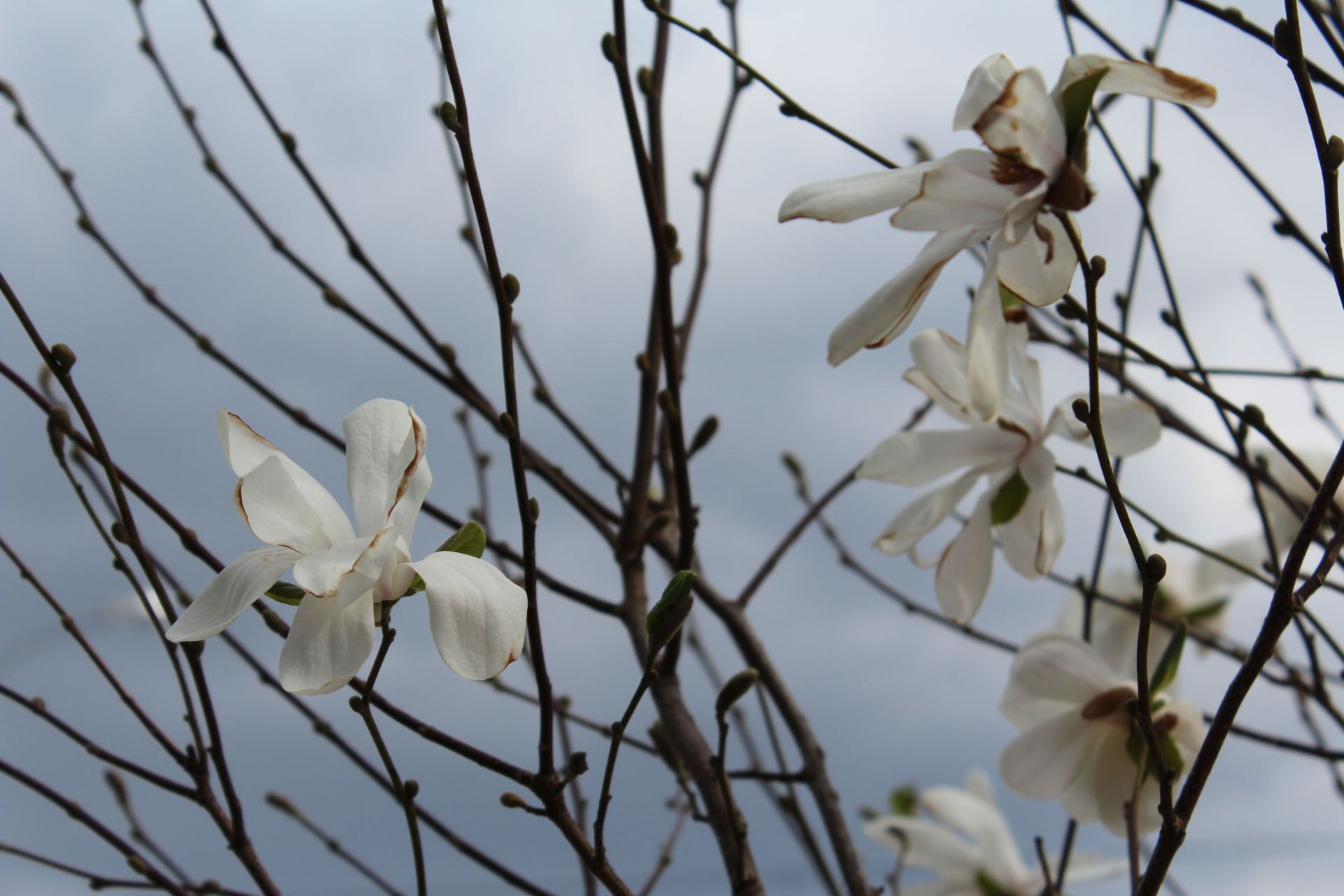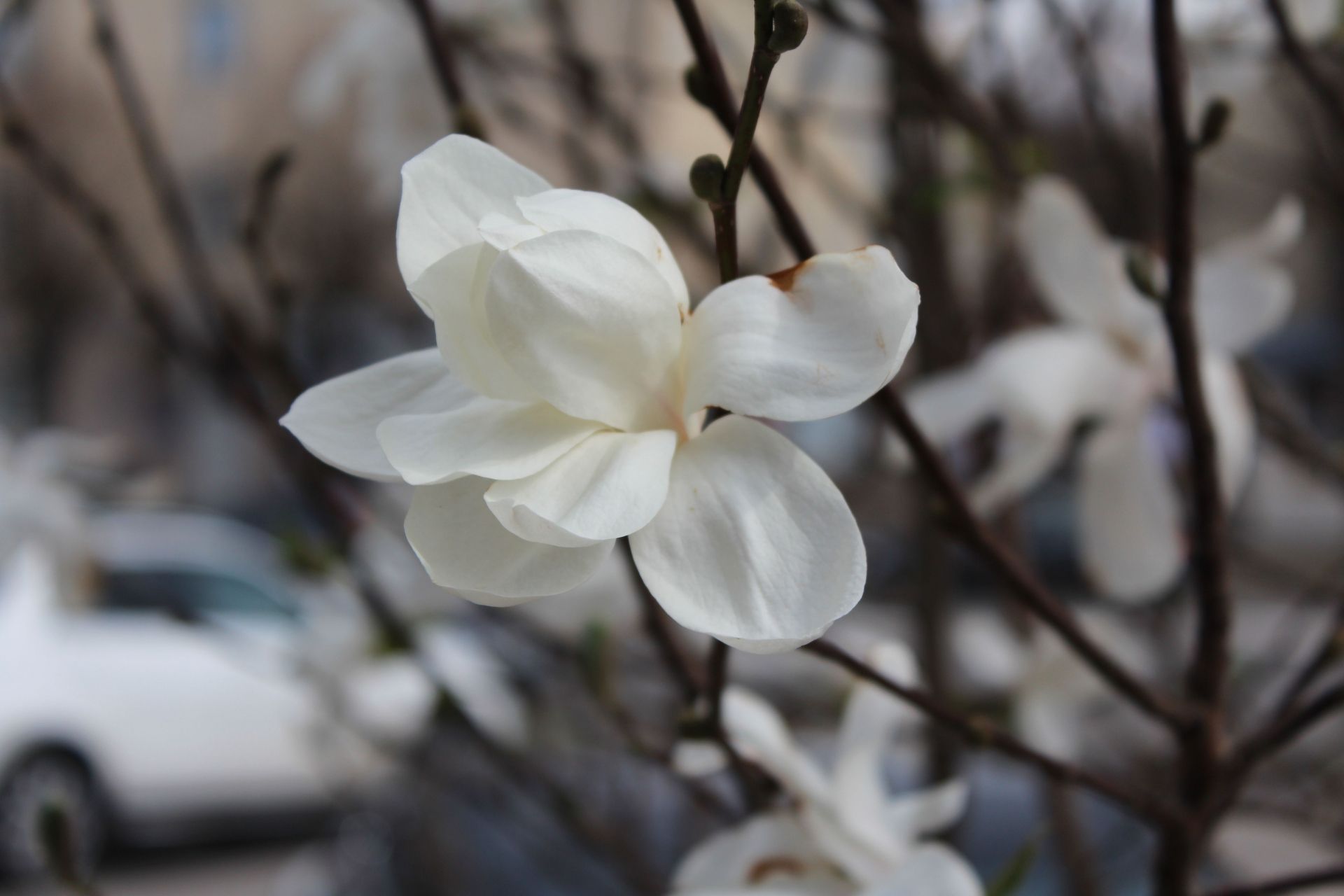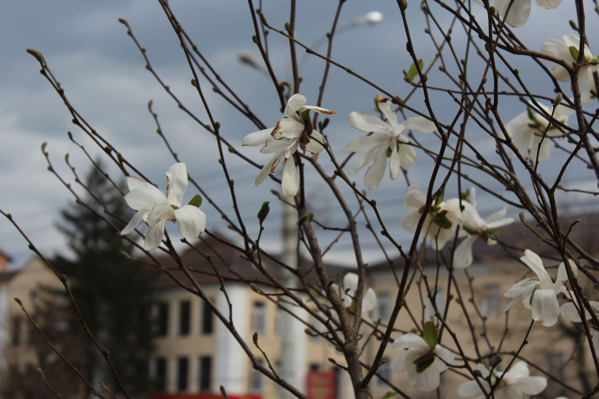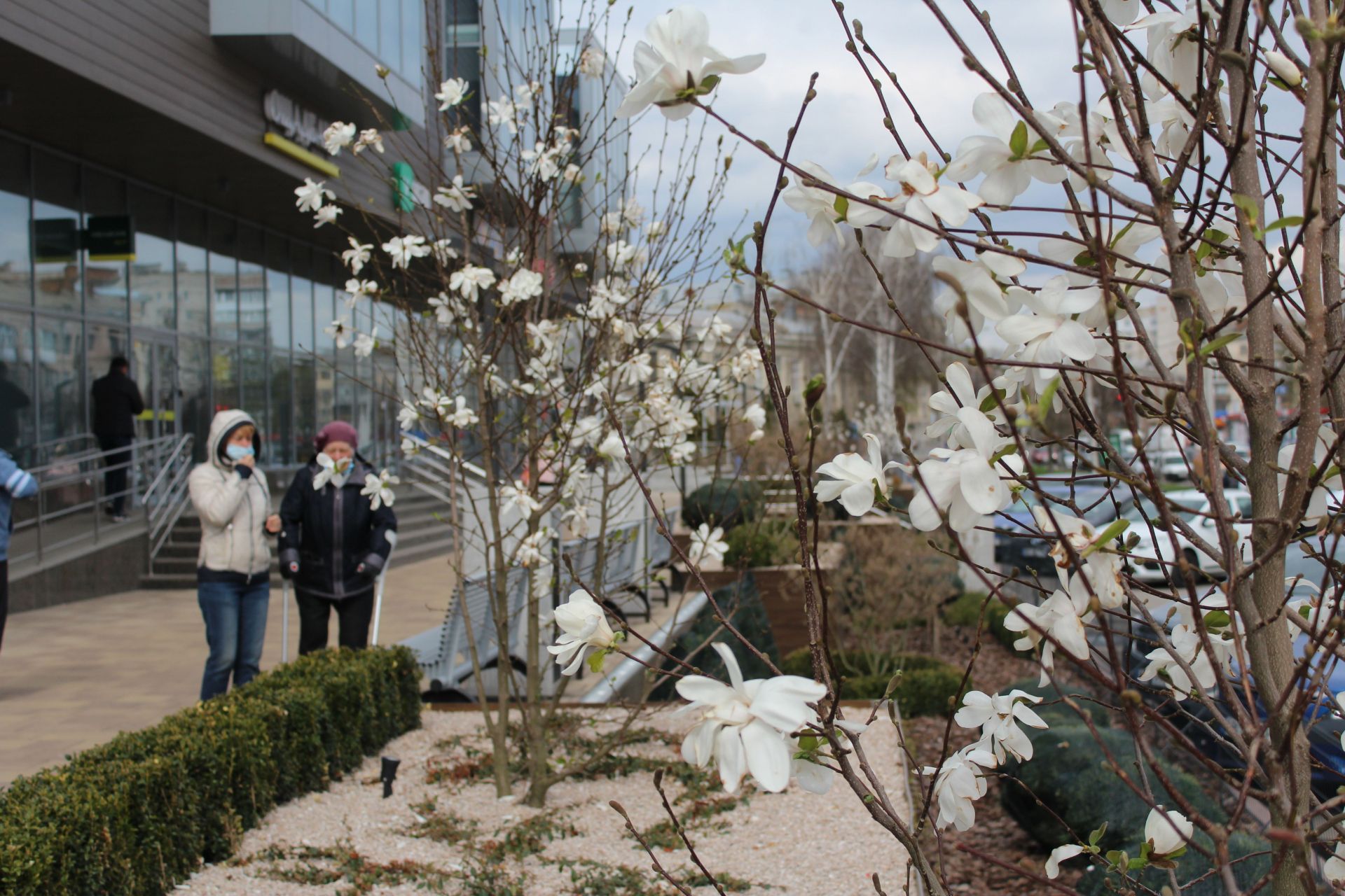 У місті також розквітчали білосніжні магнолії. Зокрема, ось такі можна побачити неподалік площі Михайла Коцюбинського.
